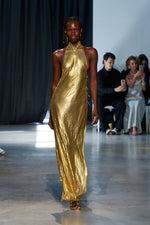 Gold metallic halter-neck gown with a slim, floor-length silhouette.