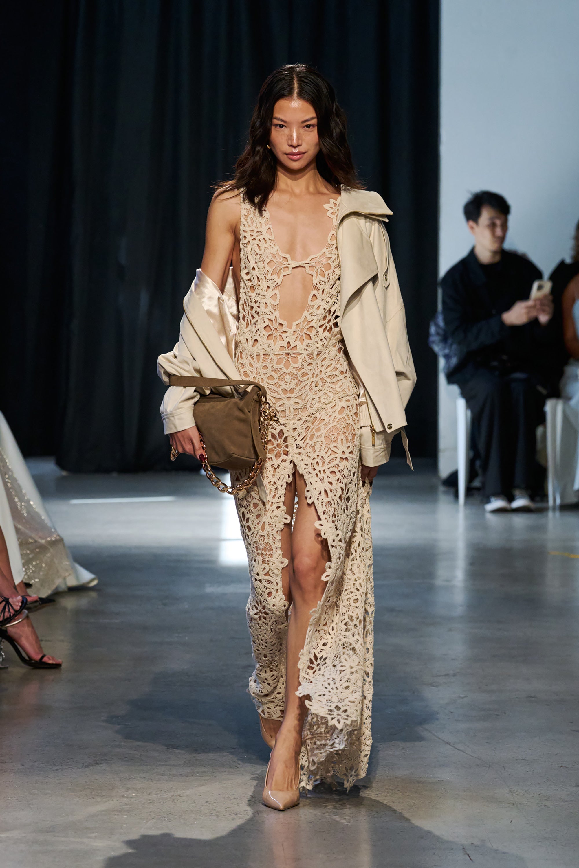 Symetrical crochet dress with center slit and cutout. Styled with off white suede jacket