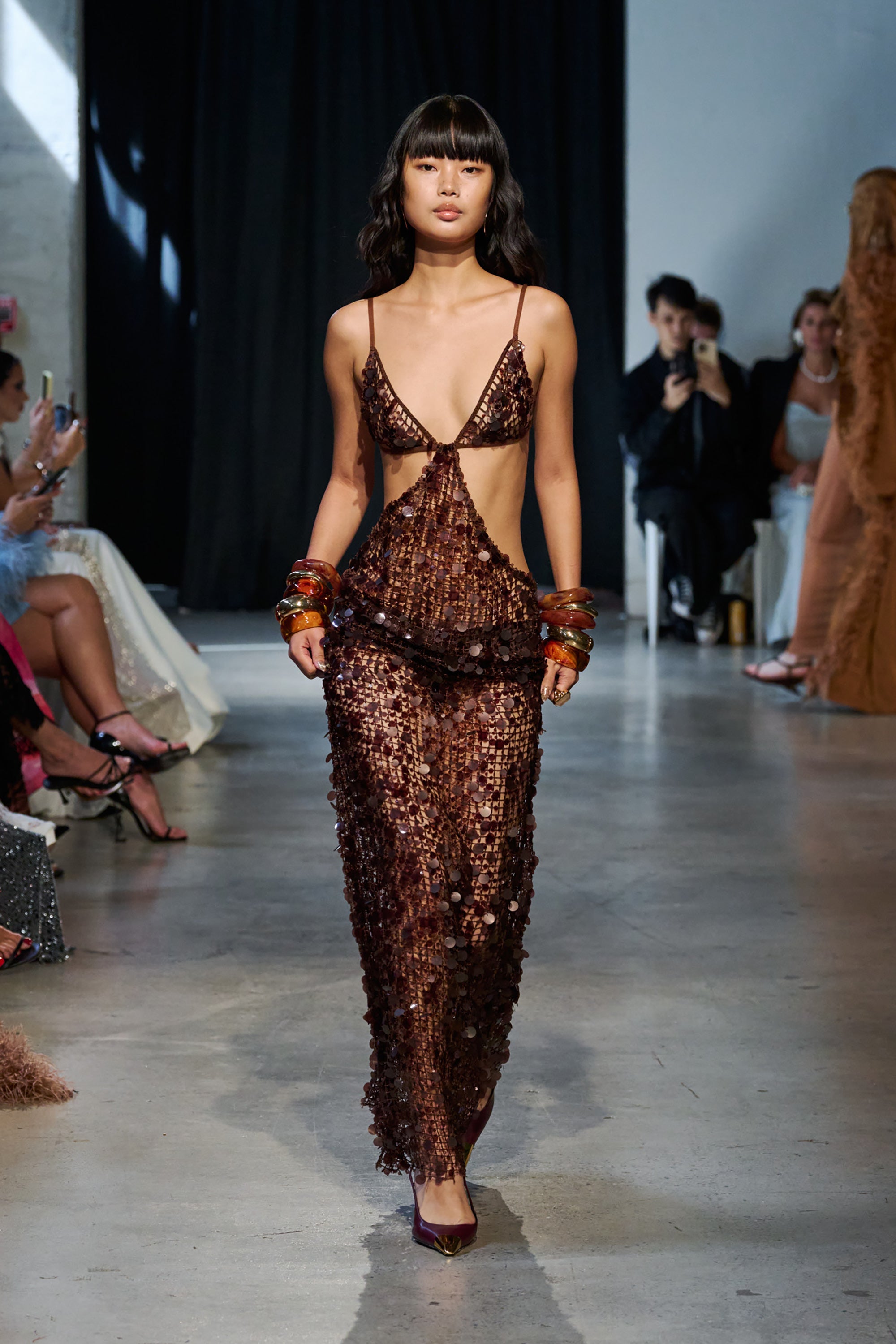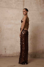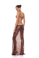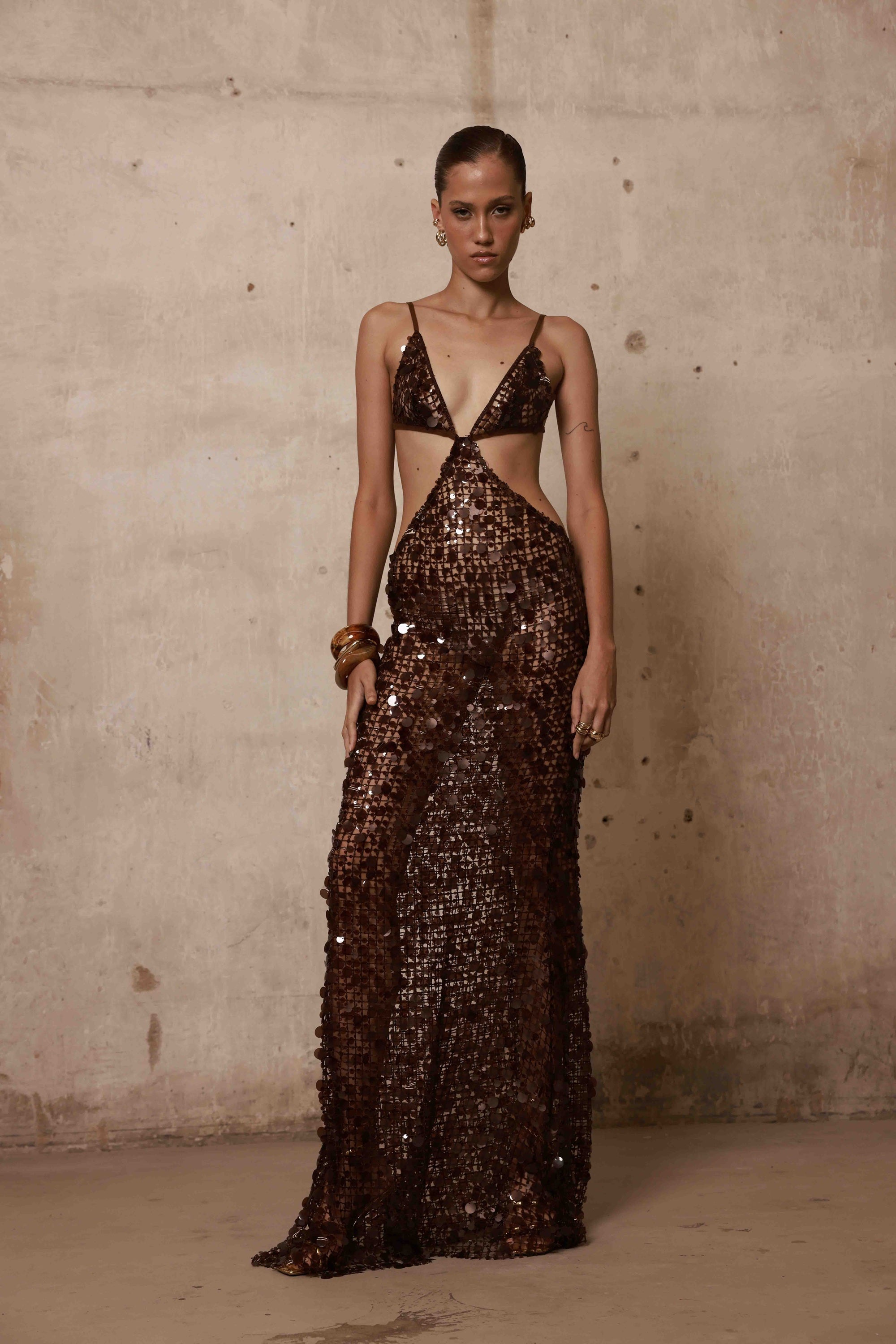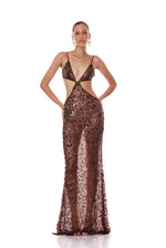 Brown piette floor-length gown with symetrical cutouts on side of the waist.