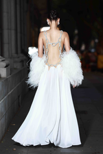Plunging v-neck gown with multiple cutouts and floor-length draping panels.