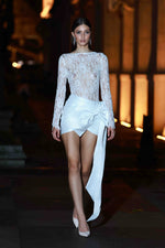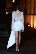 Asymmetrical mini wrap dress with structured shoulders and draped side panel.