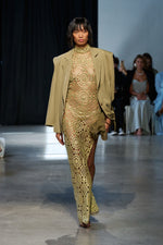 Light green crochet maxi dress with high neckline and sheer detailing, styled with blazer.
