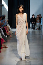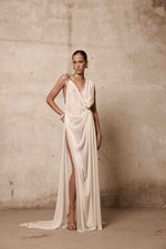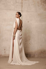 Ivory draped chiffon gown with asymmetric draping, with open left-slit and bronz rhinestones detail.
