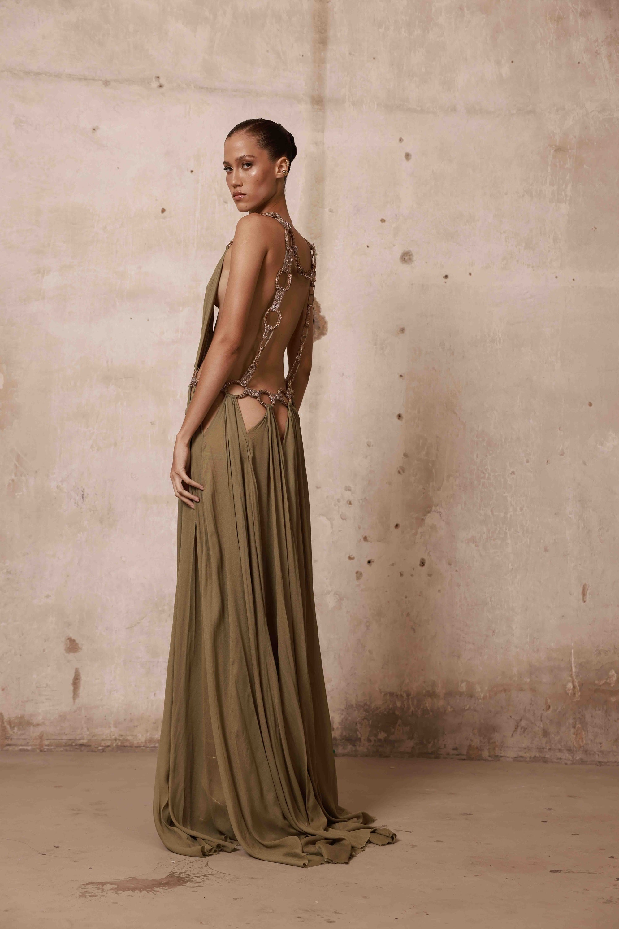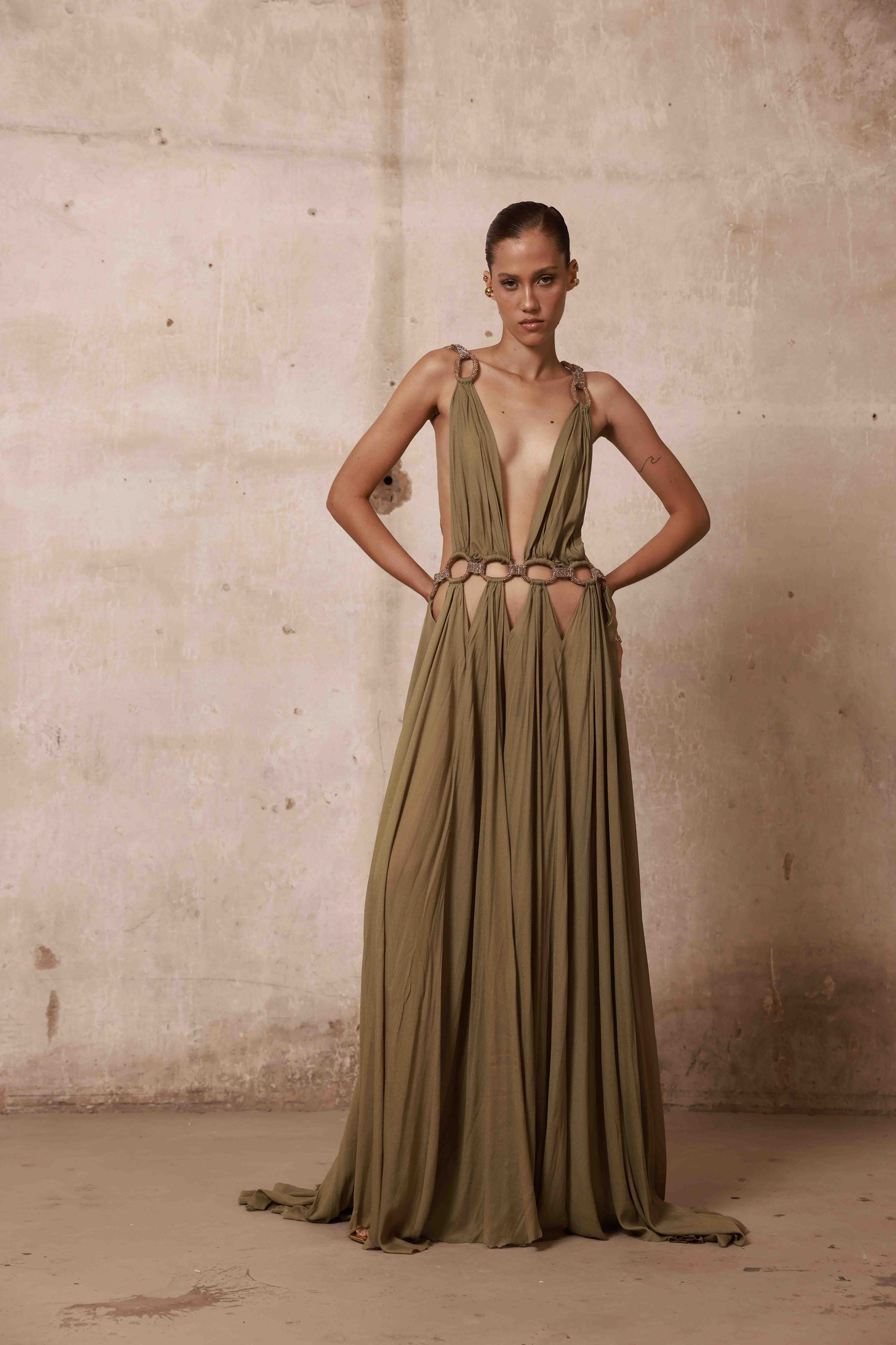Olive green gown with deep plunge halter neckline, cut-out waist detail with gold ring accents, and pleated skirt.