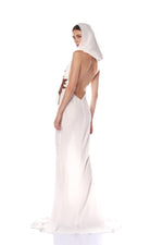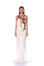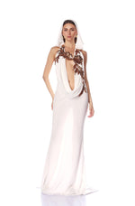 Stun in the Noemie White Dress with a plunging cowl neck and unique dragon design that creates a look both fierce and elegant.