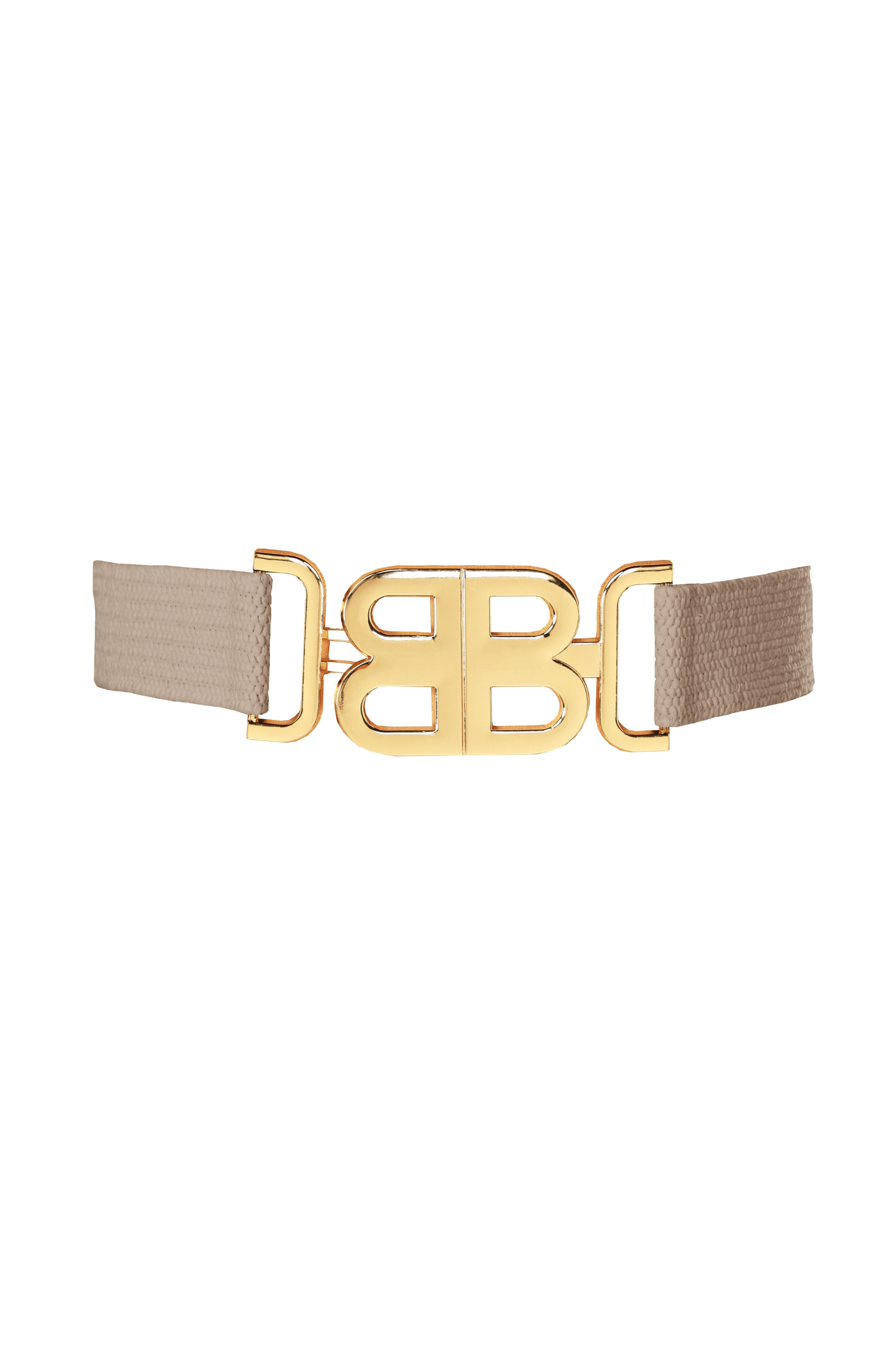 The Raffia Belt is a bold accessory featuring a wide waistband adorned with the BB logo, ensuring a statement look.
