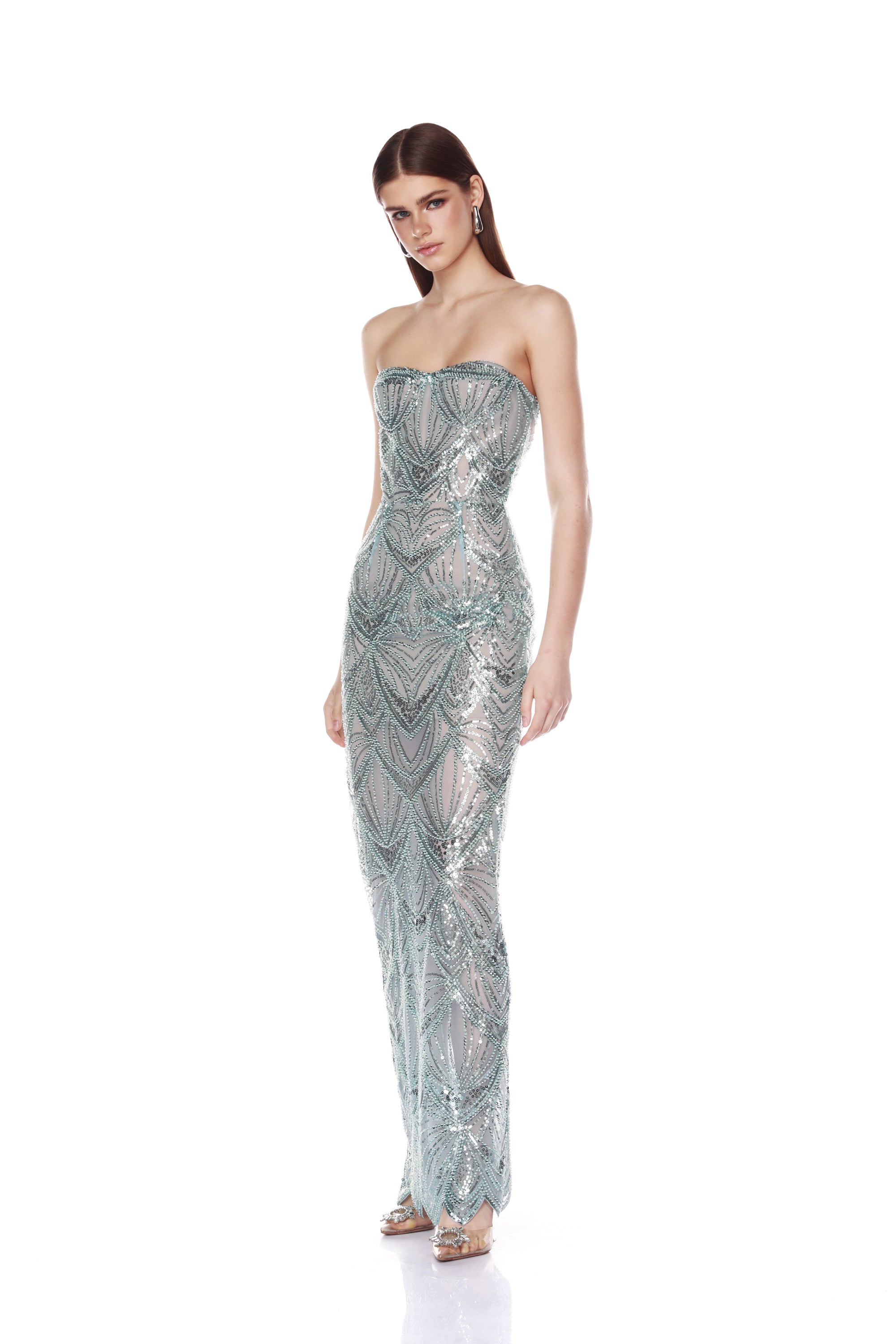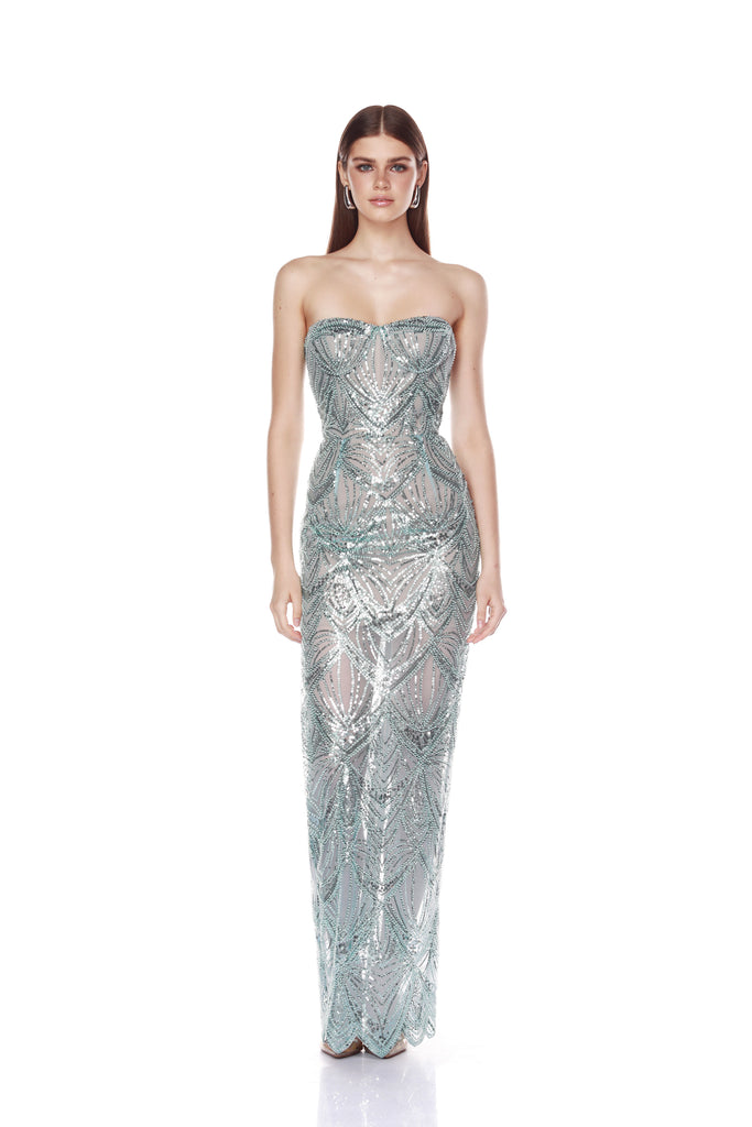 Indulge in timeless elegance with our Giselle Powder Blue Maxi Dress, featuring a strapless design and semi-sweetheart neckline for a graceful silhouette.