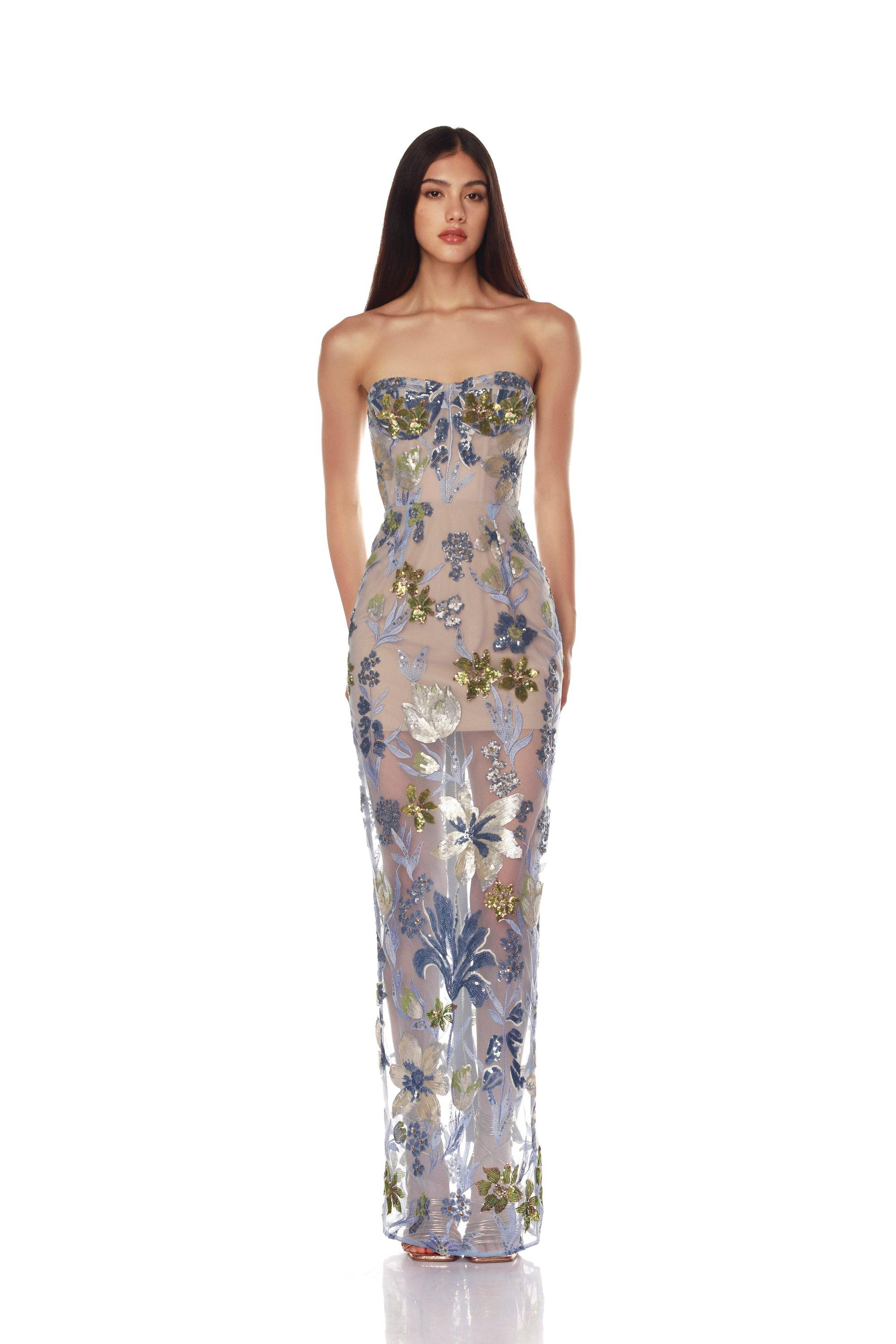 Farah Ocean Blue Sequin Multi Strapless Maxi Dress