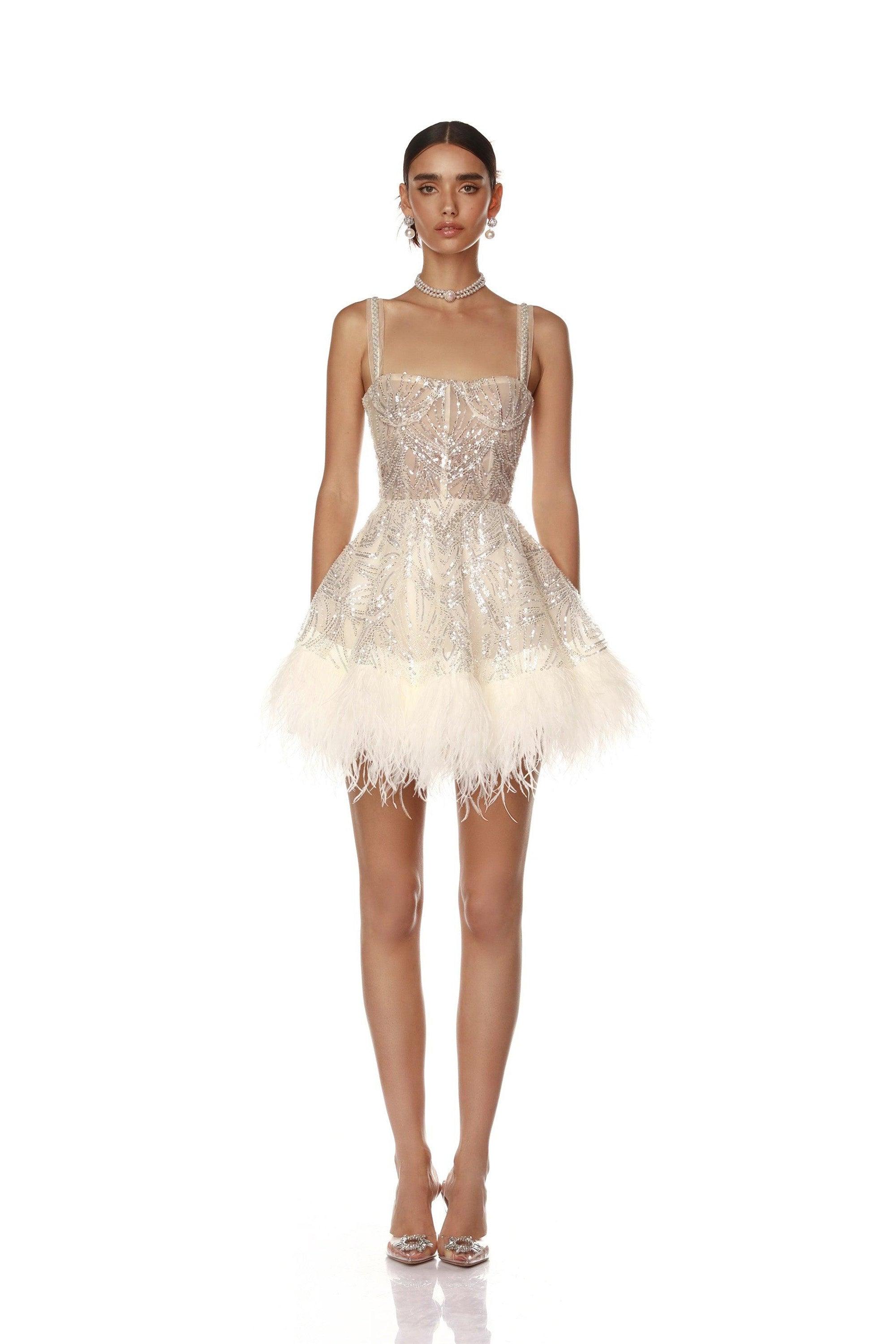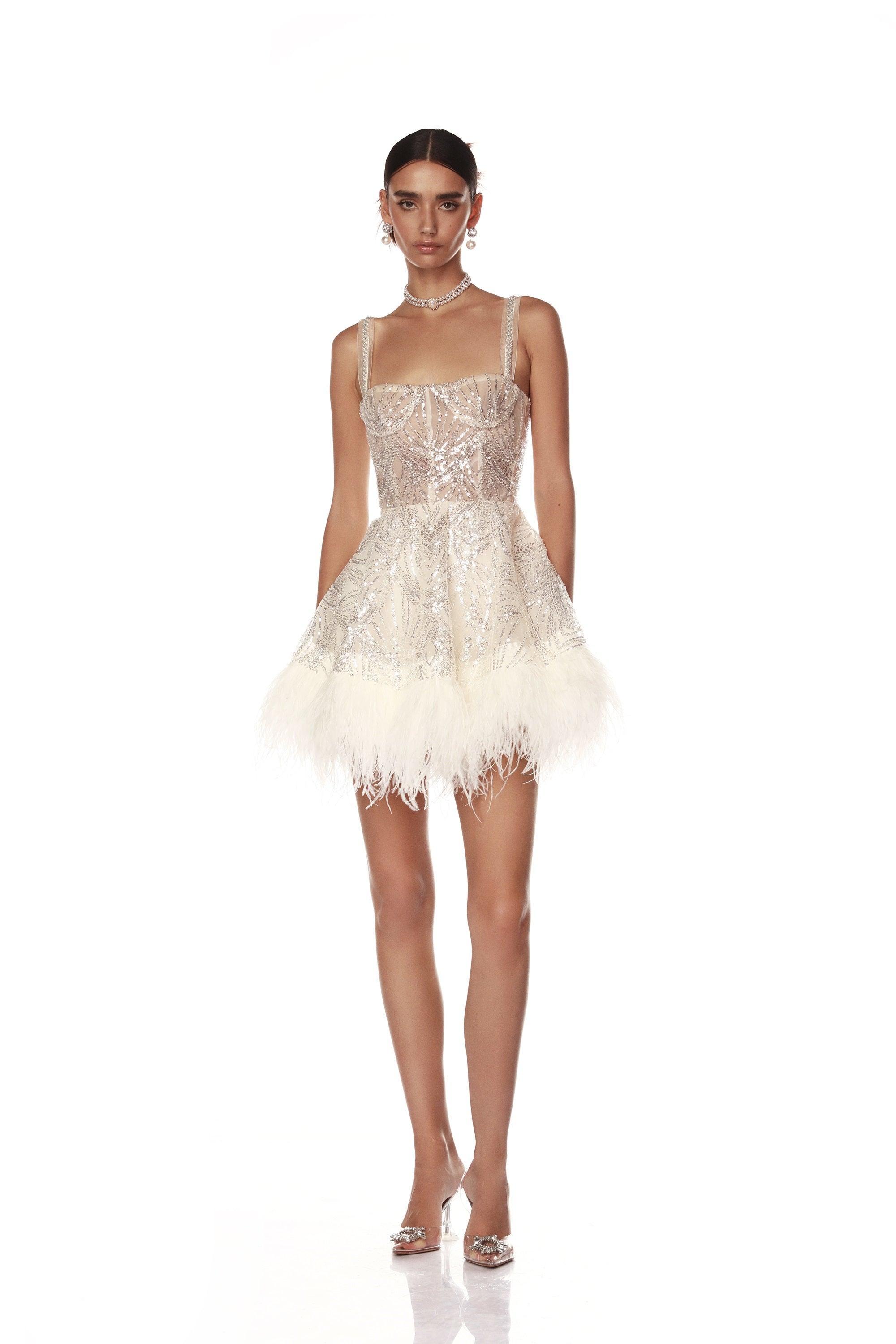 Make a statement in our Mademoiselle Beaded Bridal Mini Dress, combining glamour and sophistication for any special occasion.