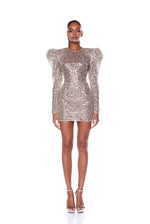 The Tessa Silver Long Sleeve Mini Dress is a show-stopping piece that radiates elegance. Featuring eye-catching balloon shoulders, this mini dress boasts a shimmering silver finish that catches the light beautifully.