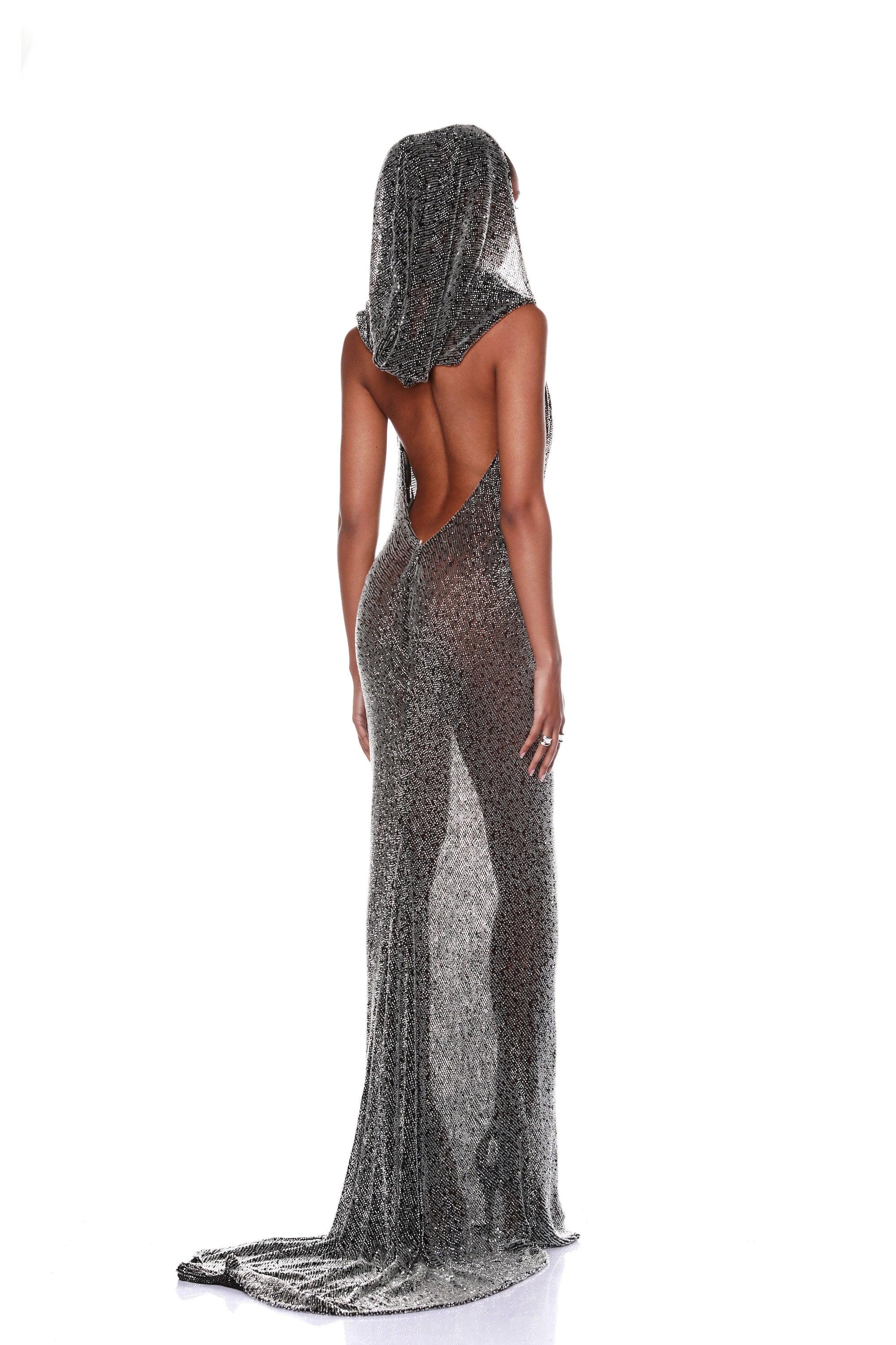 Make a statement in the Amalia Noir Beaded Gown. Featuring a dramatic detachable hood crafted from heavyweight beaded fabric, this gown exudes elegance.