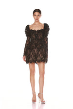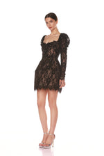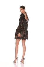 Embrace feminine grace in our Colette Noir Lace Long Sleeve Mini Dress.