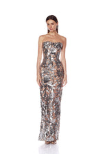 Embrace vibrant elegance in our Dahlia Dark Silver Strapless Maxi Dress, featuring shimmer sequin and a column silhouette perfect for any special occasion.