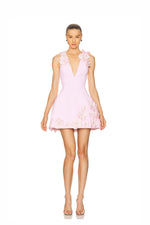 Refined and romantic, the Estelle Mini Dress features a flattering V-neckline and delicate floral appliqué that adds an elevated touch. The perfect balance of elegance and femininity.