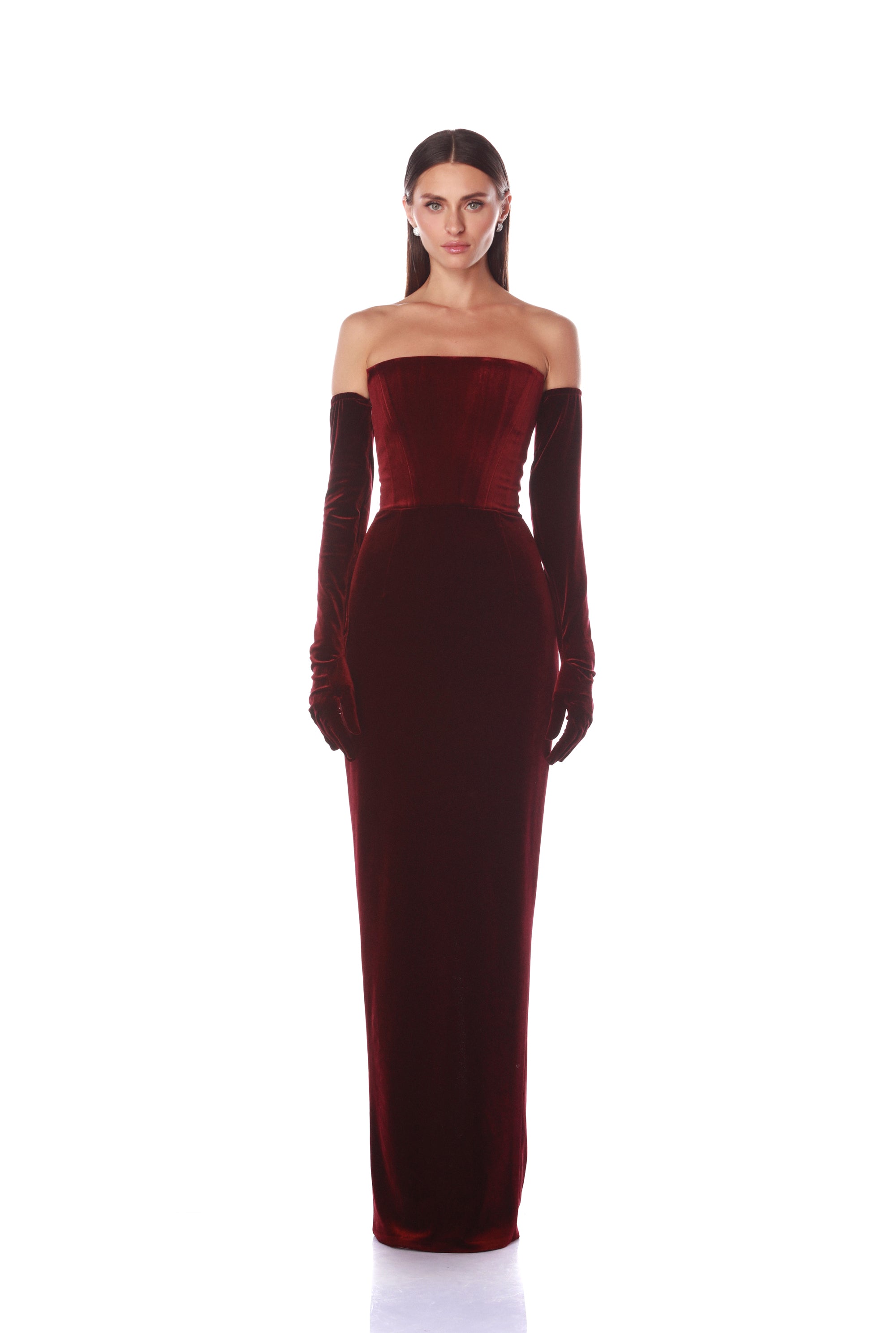 Exude elegance and poise in the Florentina Burgundy Strapless Velvet Gown.
