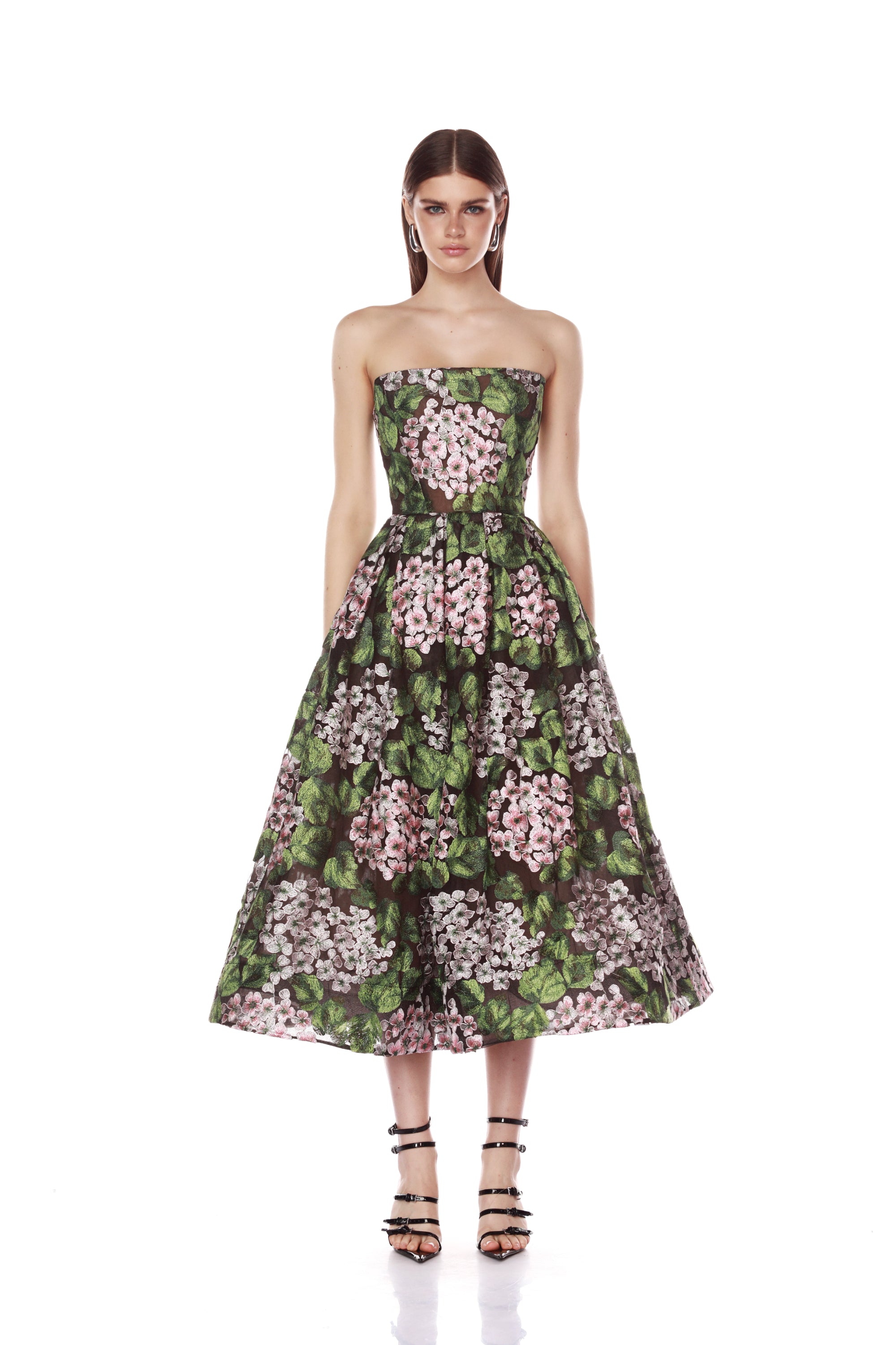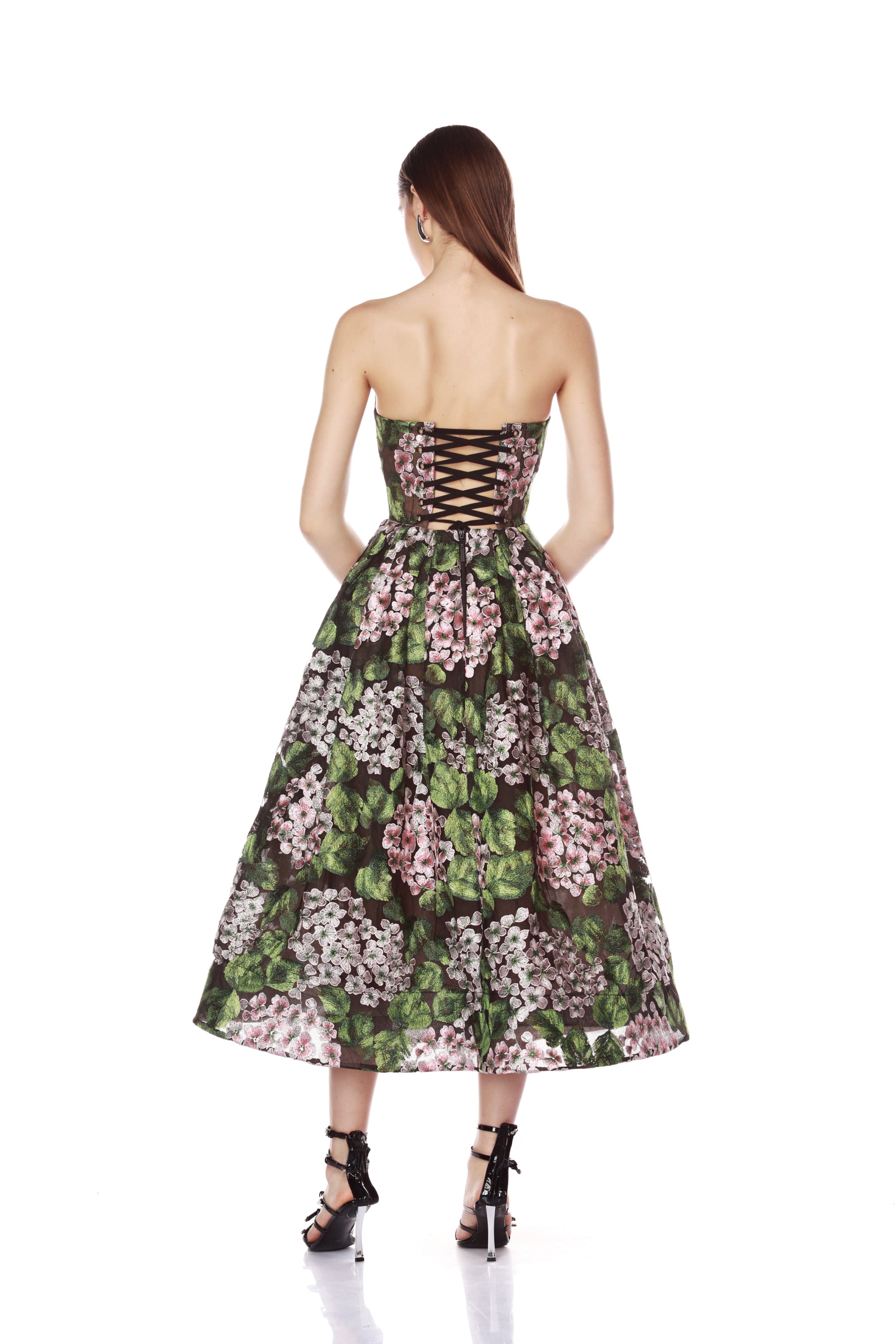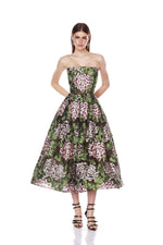 Bloom with confidence in our Kate Strapless Midi Dress, a delightful blend of vibrant prints and flirty style that’s perfect for any occasion.