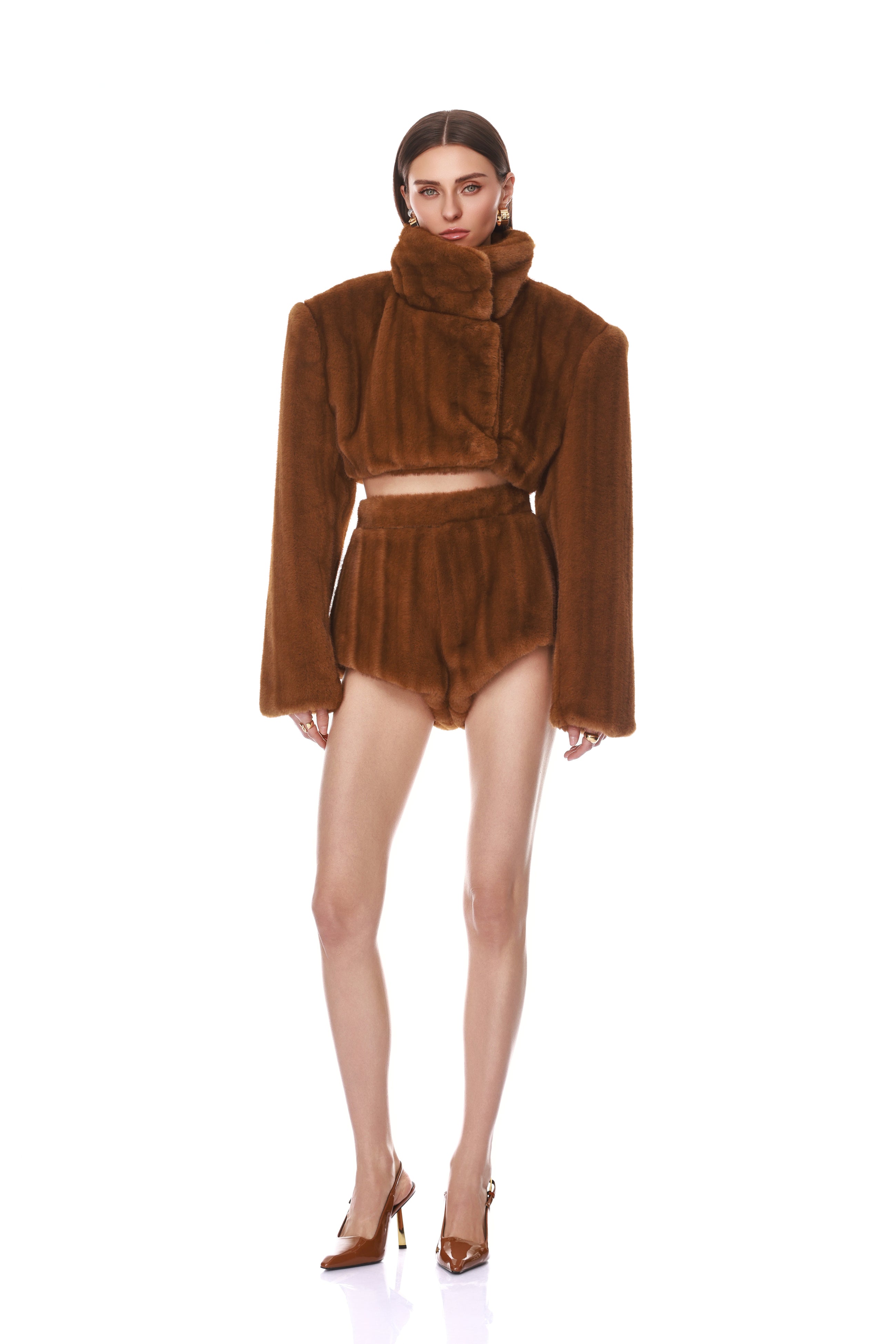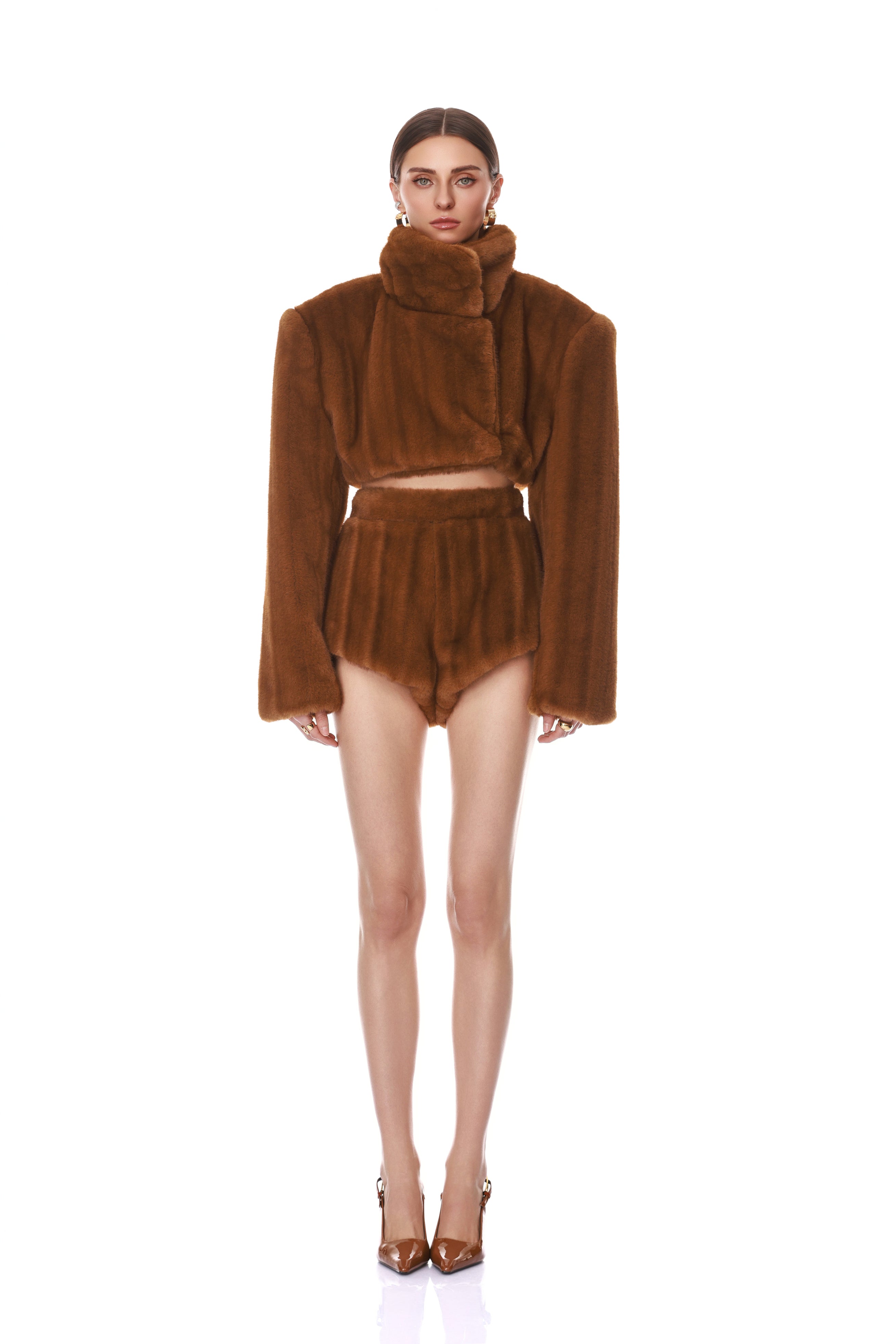 Look 9: Faux Mink Long Sleeve Cropped Jacket + Faux Mink Shorts