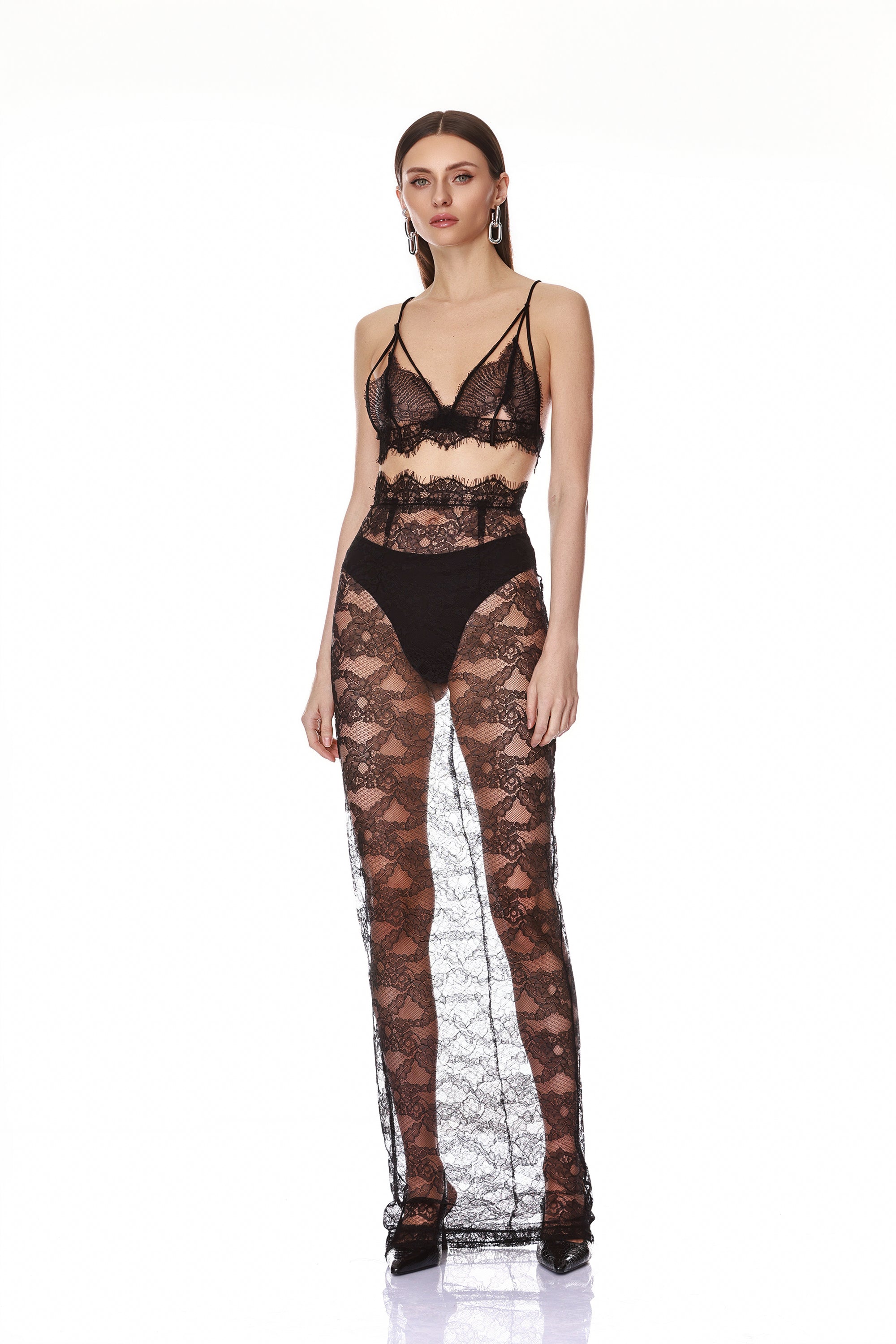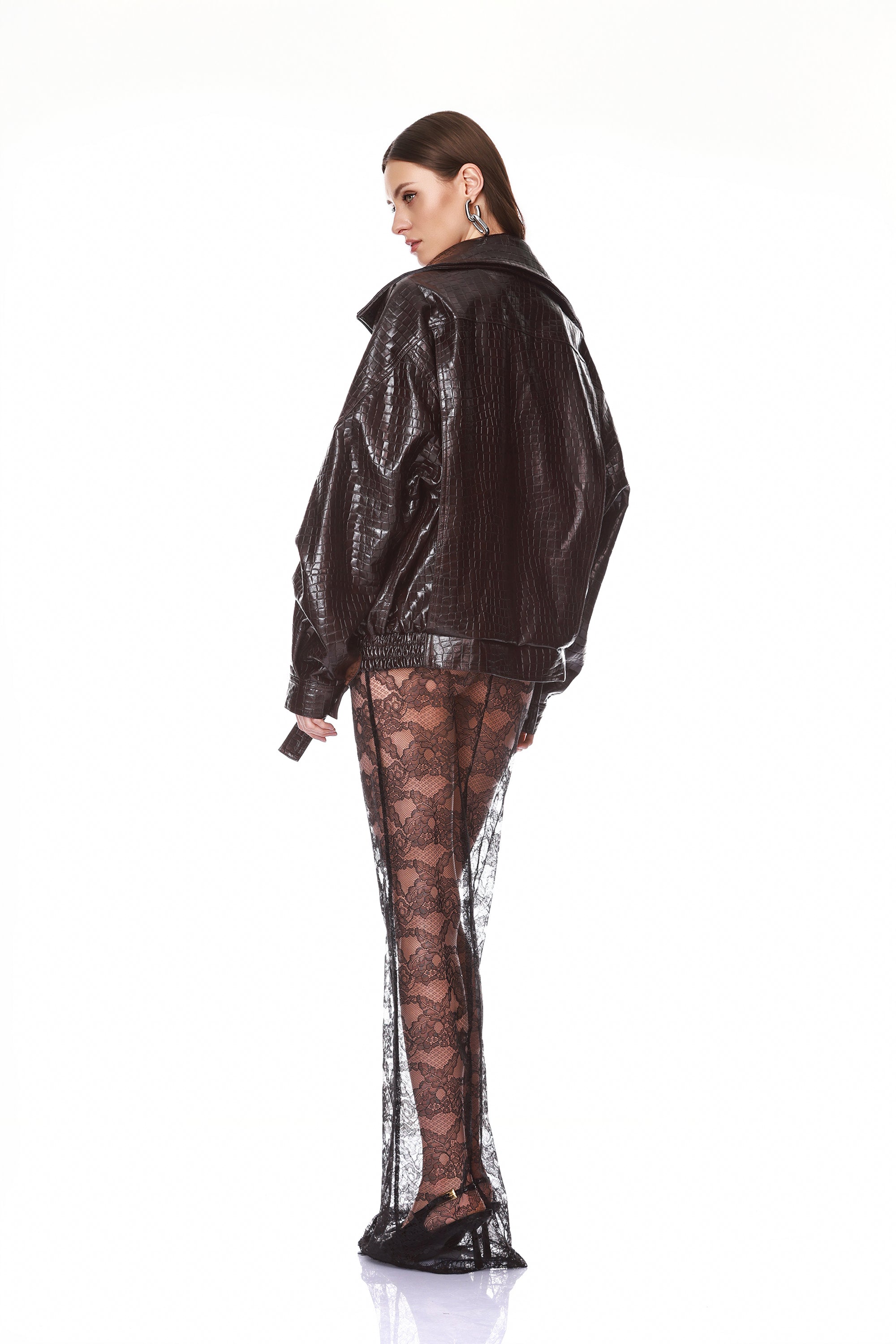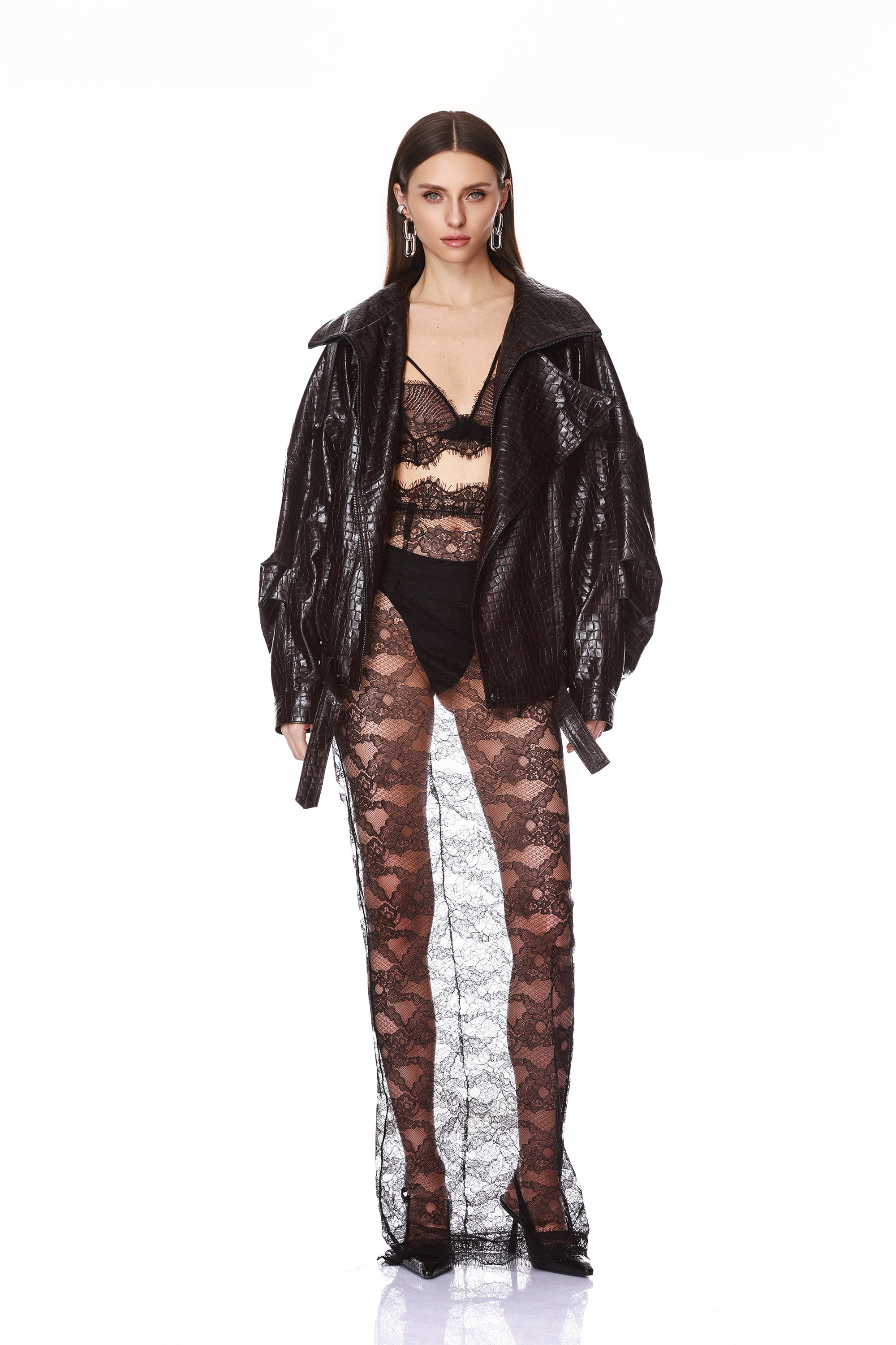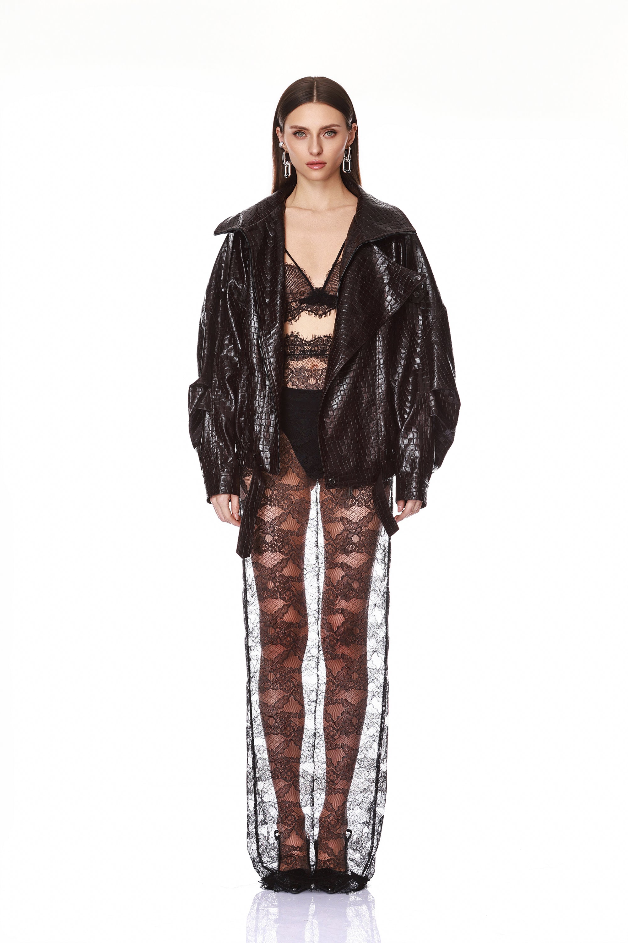 Look 4: Vegan Croc Embossed Jacket + Lace Bralette + Lace Maxi Skirt