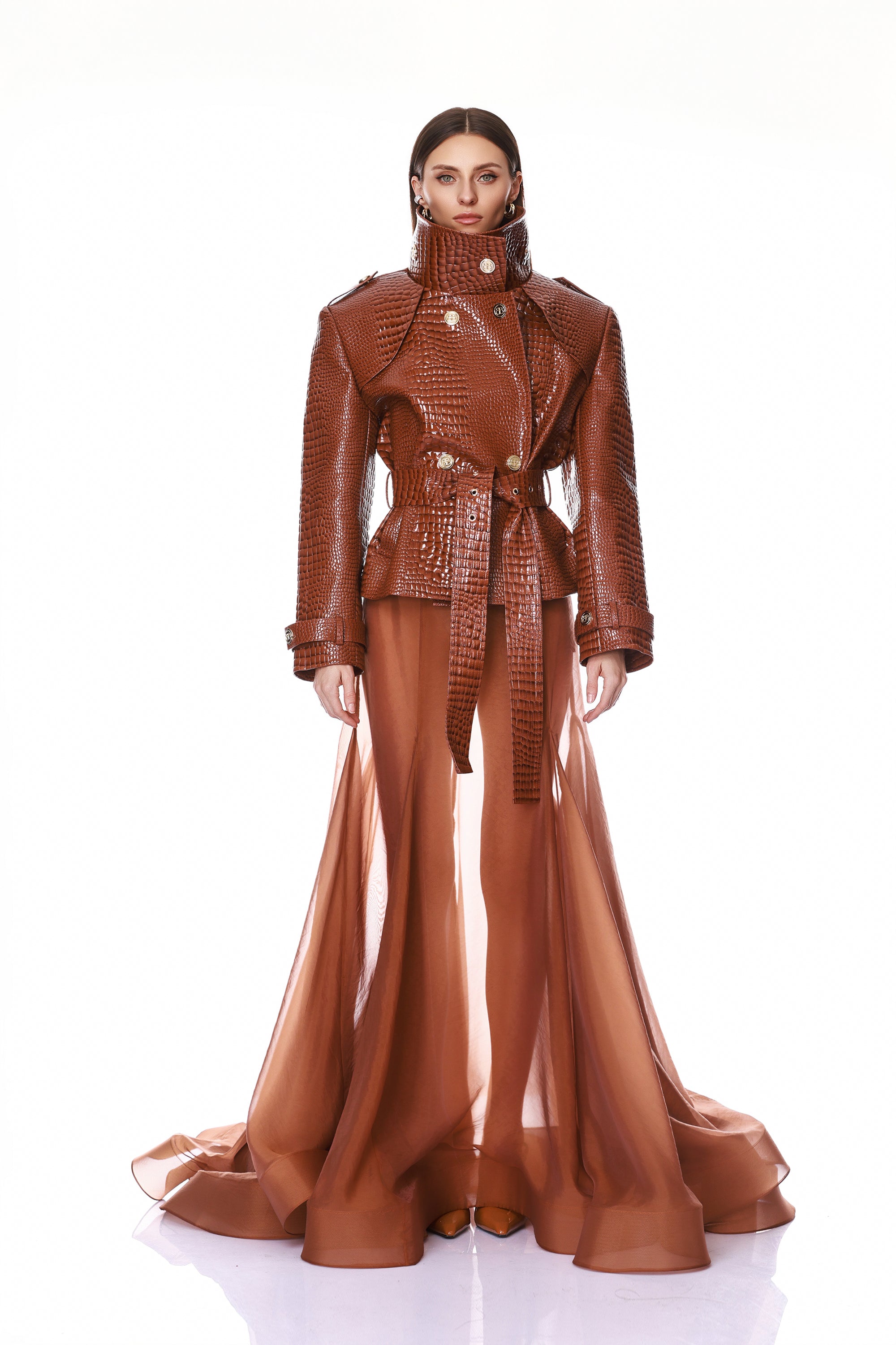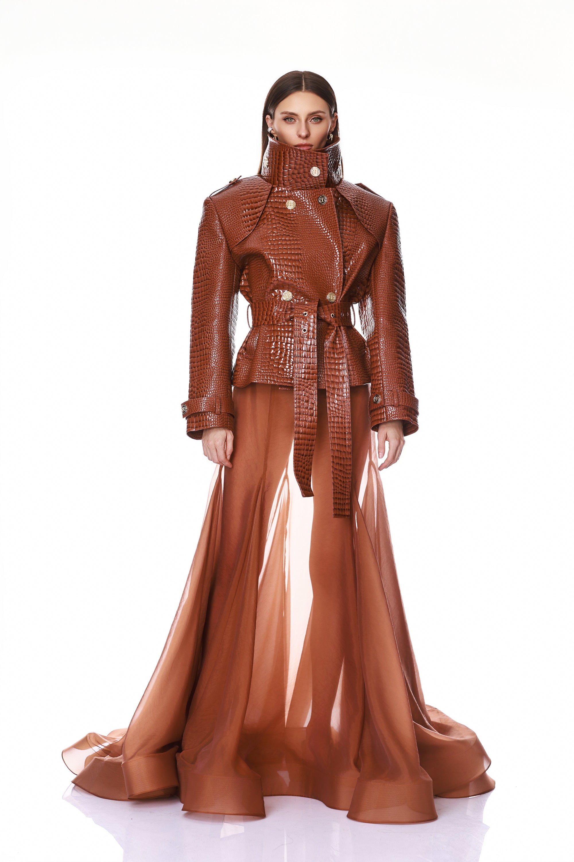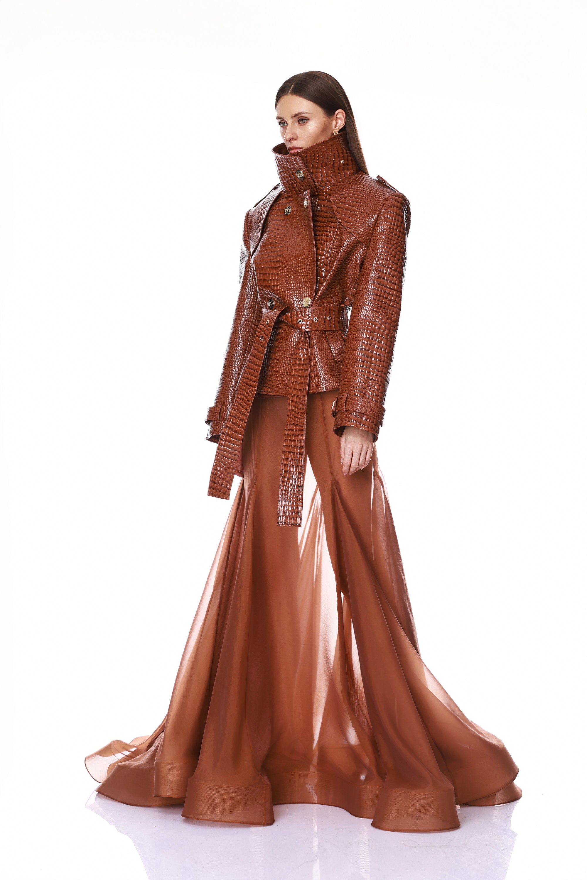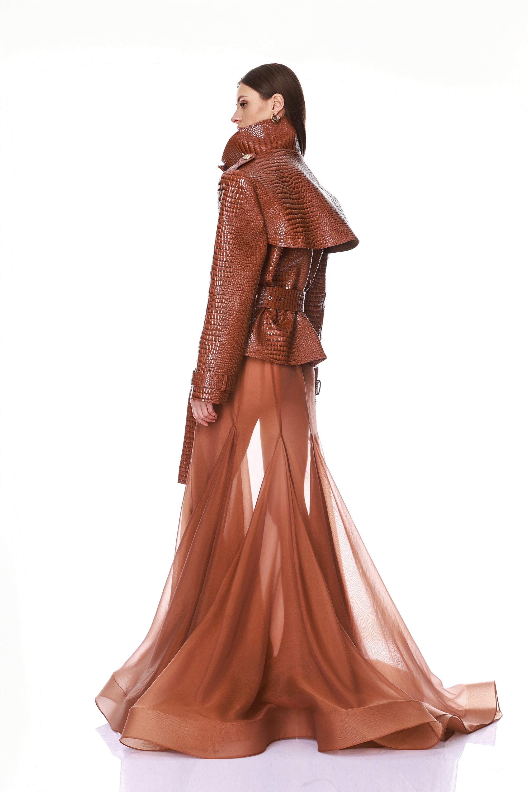Look 1: Vegan Croc Embossed Brown Biker Jacket + Camel Chiffon Maxi Skirt
