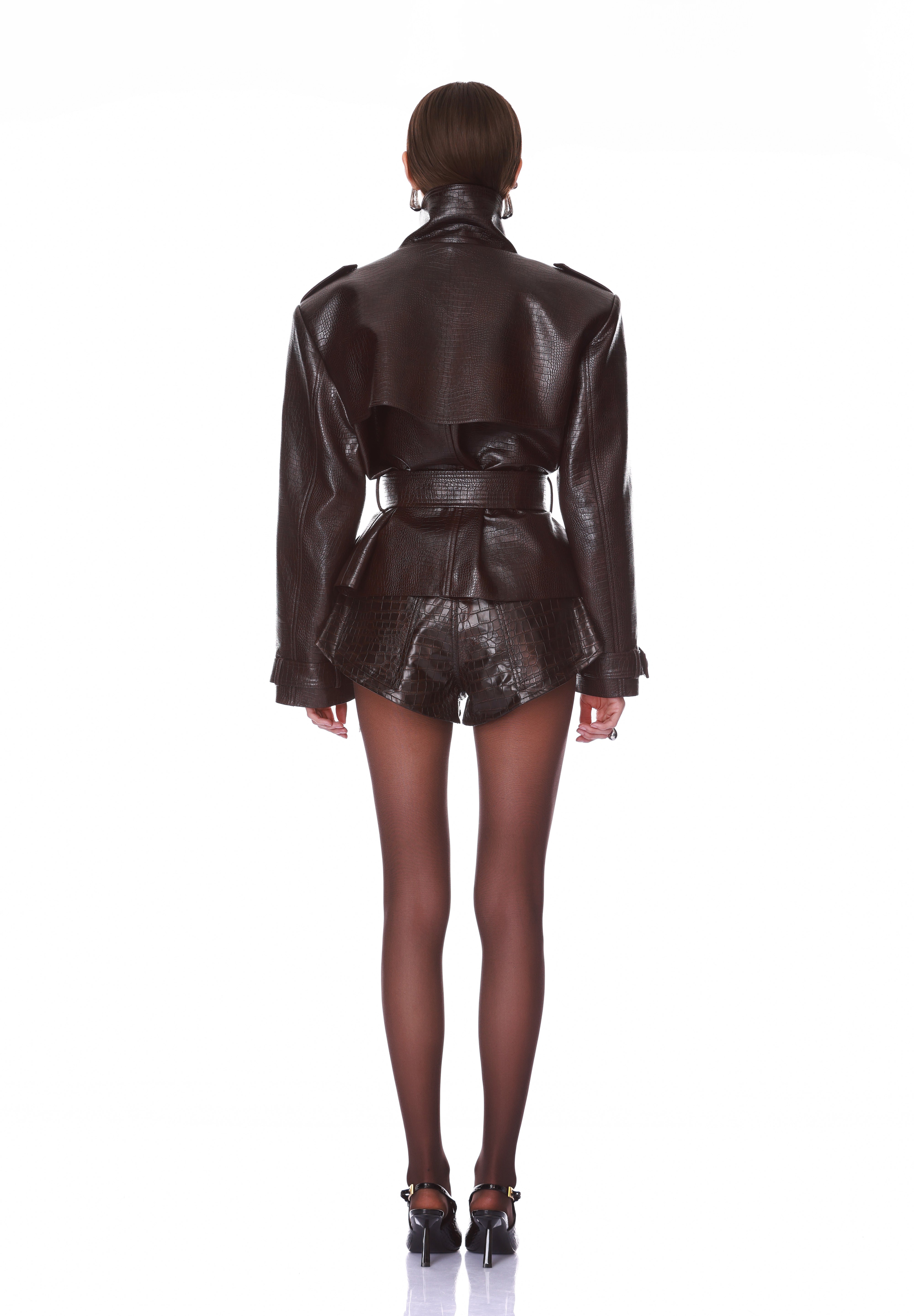 Look 12: Woven Leather Trench Coat + Cable Knit Sweater + Vegan Croc Embossed Shorts