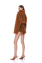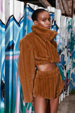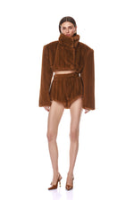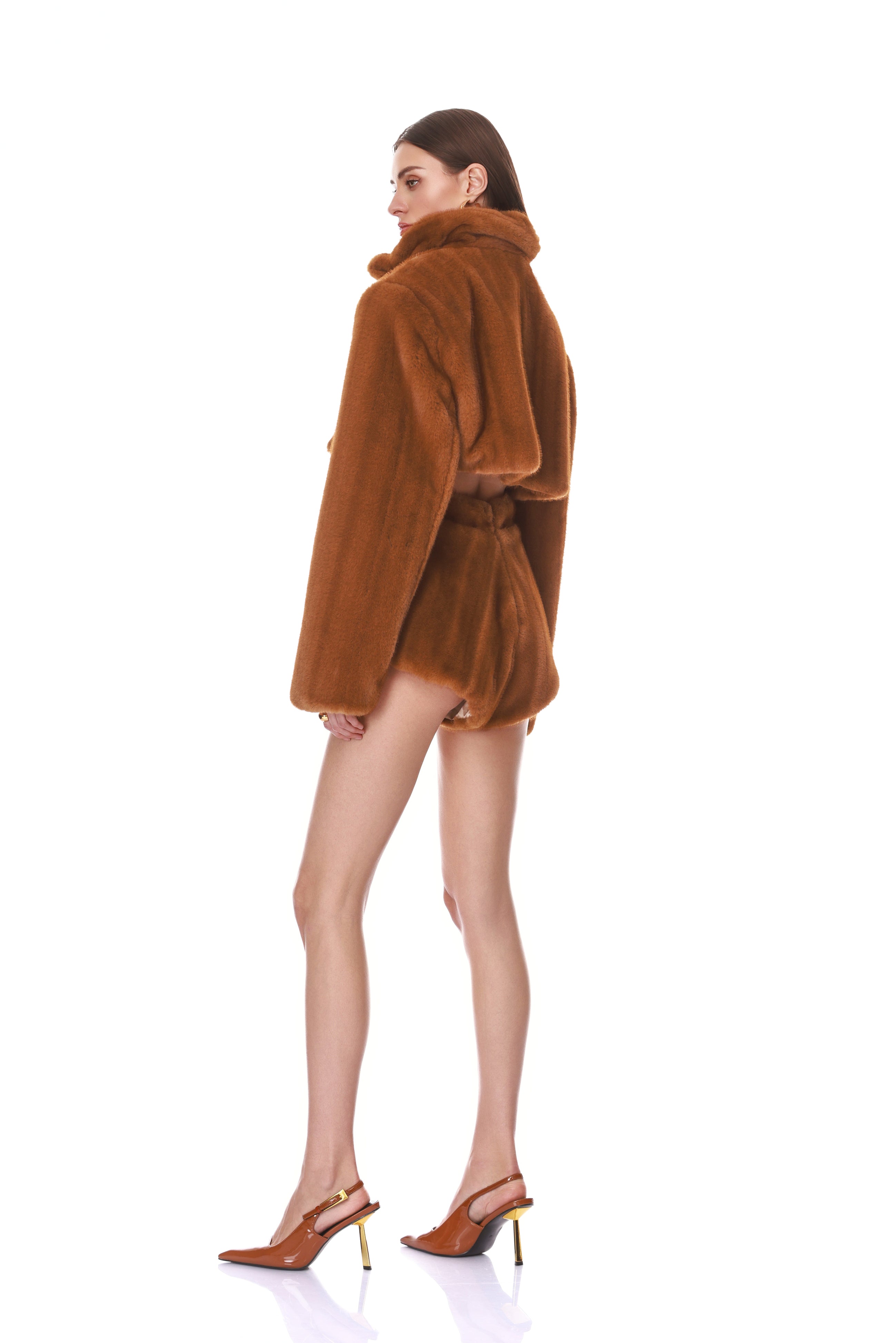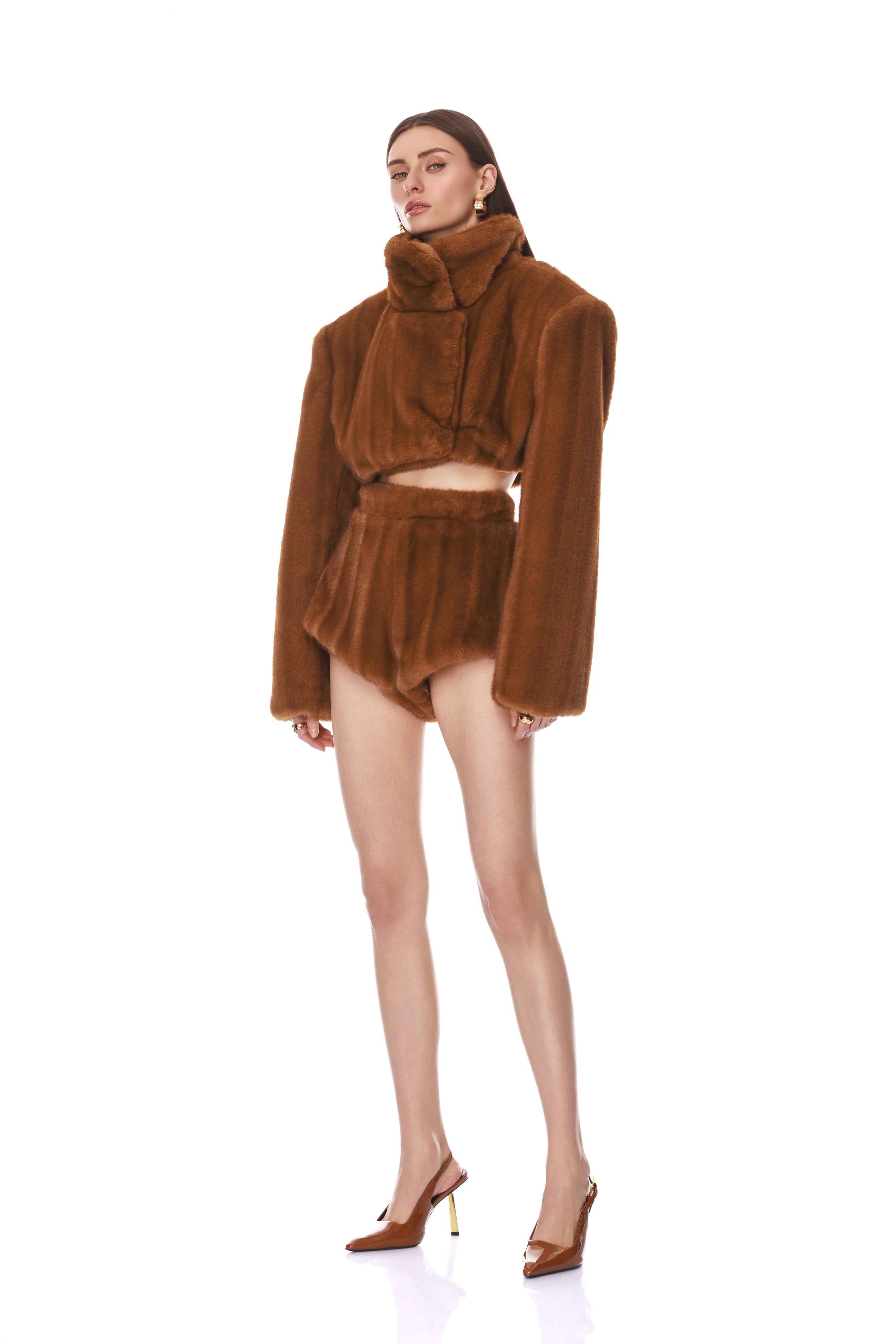 - Brown Faux Mink Cropped Jacket with Brown Faux Mink Micro Shorts