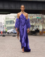 - Indigo Silk Halterneck Gown with Feather Sleeves