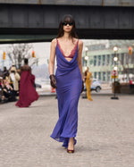 - Indigo Cowl Neck Gown with Burgundy Lace Detail