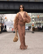 Look 39: Chiffon Cowl Deep V-Neck Camel Gown + Feather Sleeves