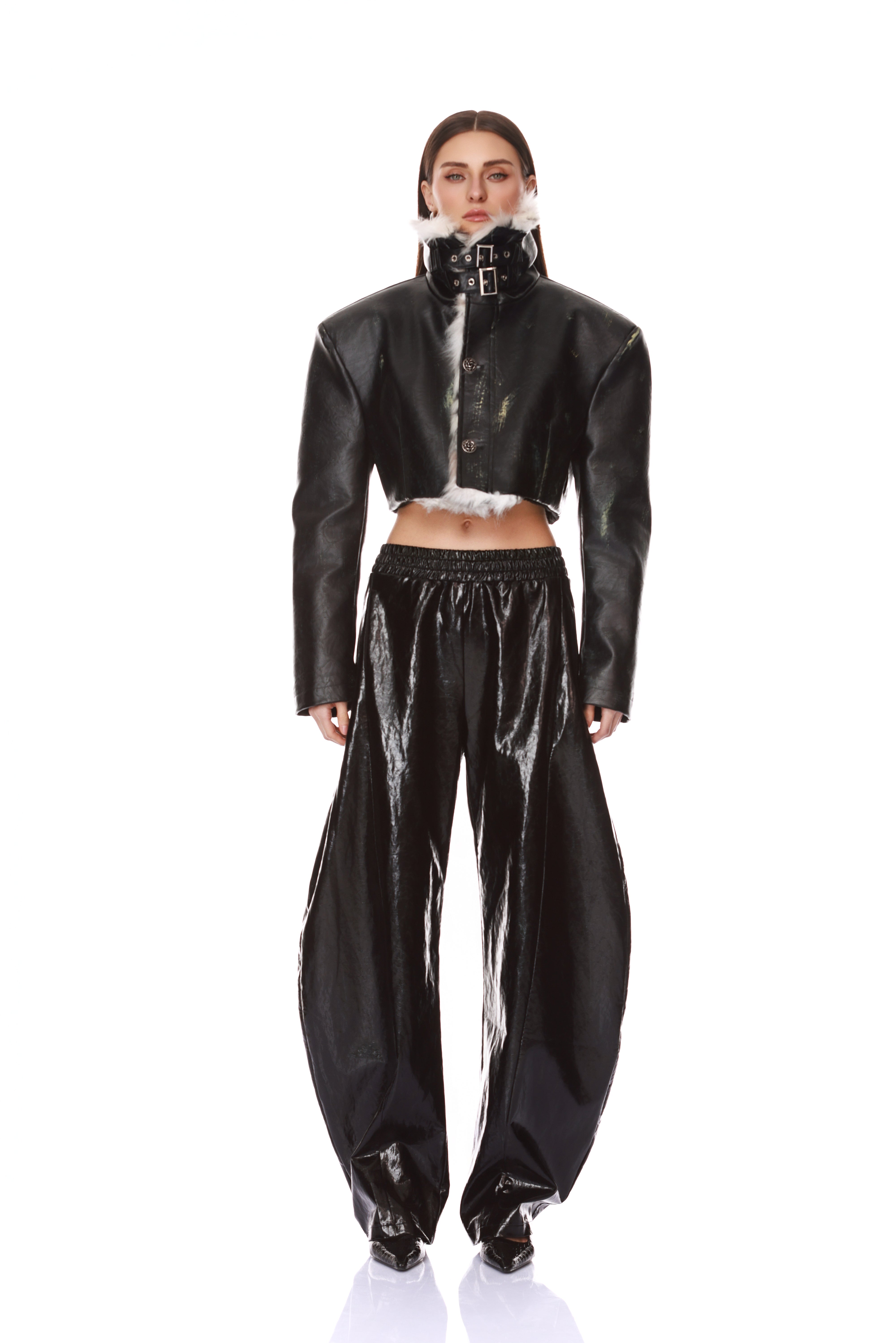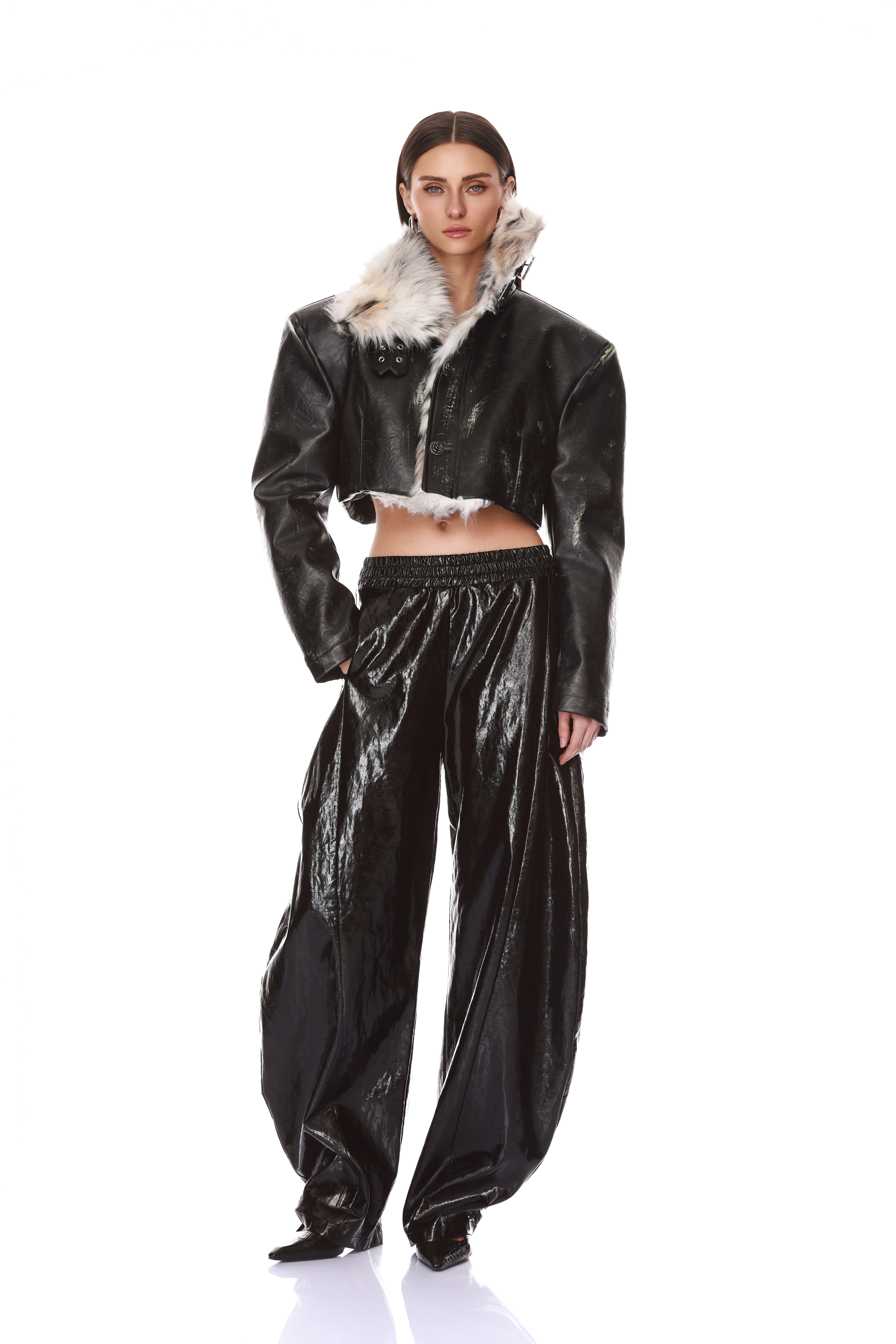 - Cropped Patent Jacket with Faux Fur Lining + Vegan Patent Leather Horseshoe Trouser
