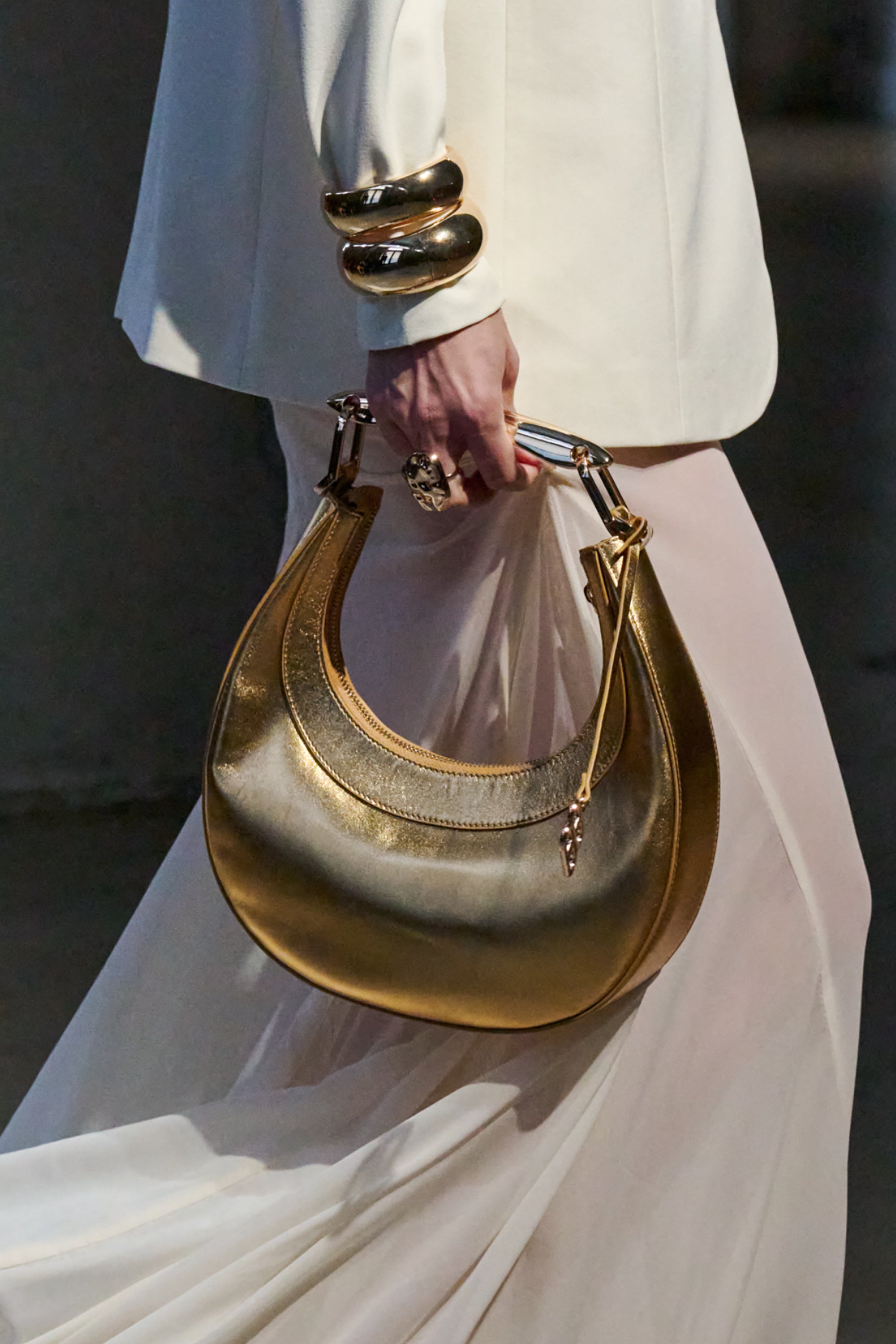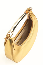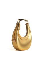 A midi crescent silhouette handbag crafted in an alluring metallic gold leather, featuring a polished brass top handle.