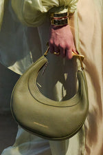 A midi crescent silhouette handbag crafted in an eye-catching olive leather, featuring a polished twisted brass top handle.