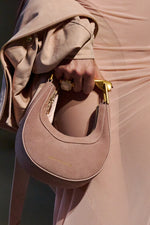 A mini crescent silhouette handbag crafted in a soft blush suede, featuring a polished twisted brass top handle.