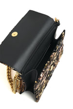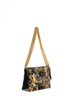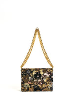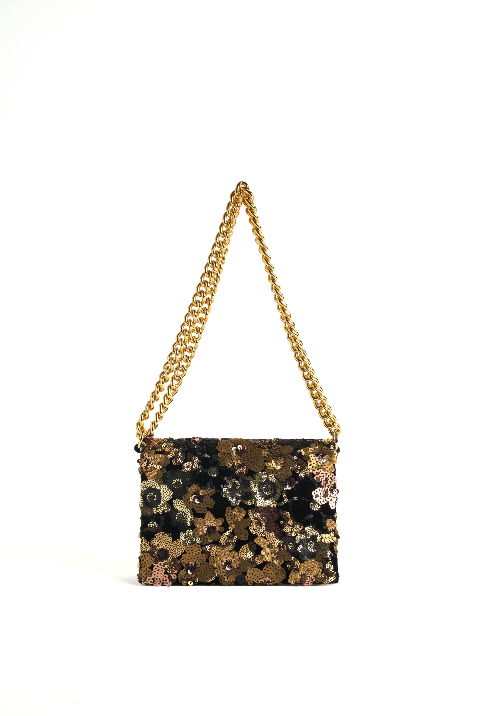 Radiating after-dark allure, this sequin-embroidered bag embodies Bronx and Banco’s signature glamour. Adorned with intricate floral sequins in rich gold and bronze tones, it’s finished with a statement gold chain strap for a touch of opulent edge.