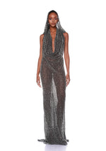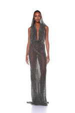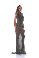 Make a statement in the Amalia Noir Beaded Gown. Featuring a dramatic detachable hood crafted from heavyweight beaded fabric, this gown exudes elegance.