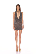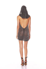 Make a statement in the Amalia Noir Mini Dress featuring a dramatic detachable hood, crafted from heavyweight beaded fabric.