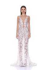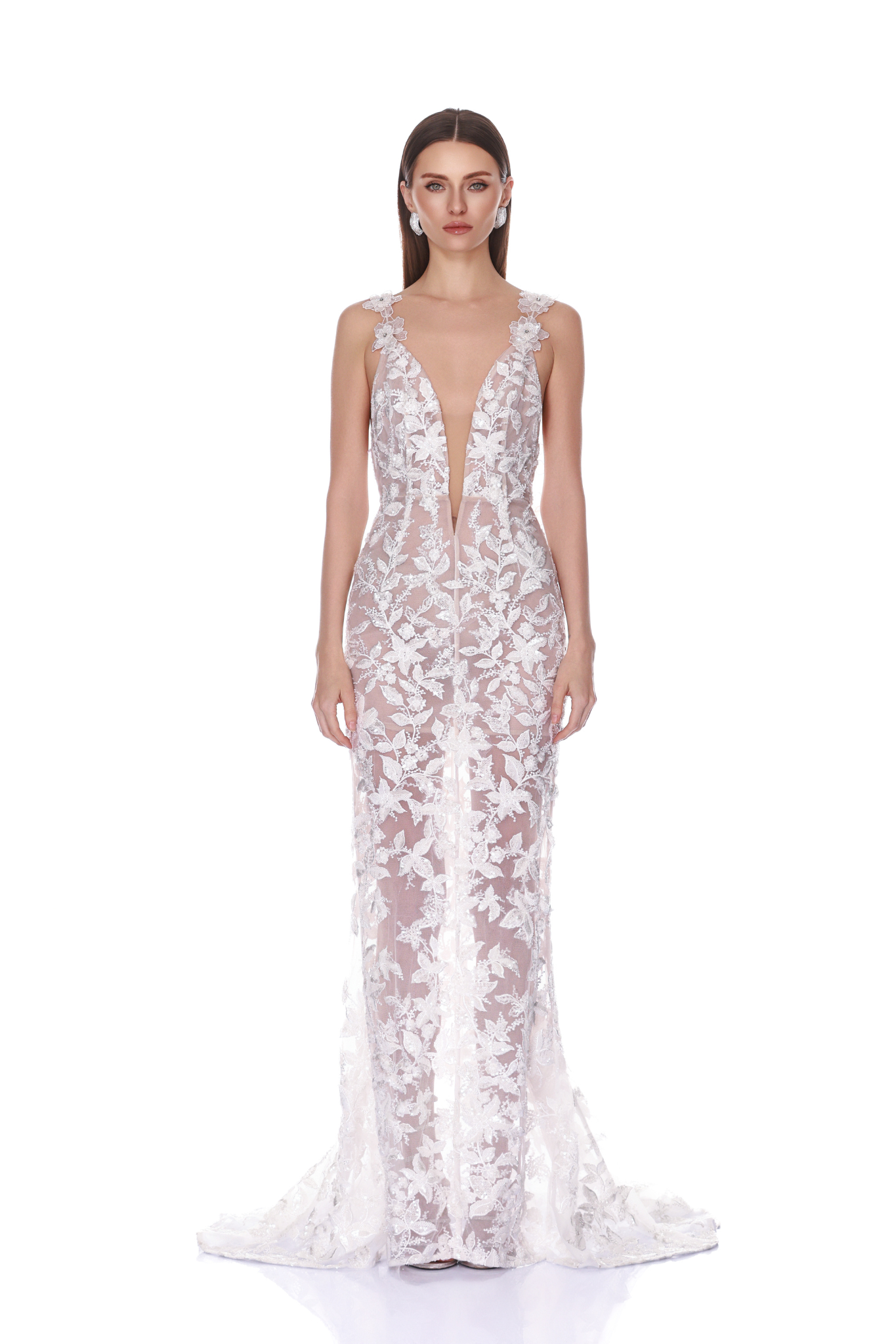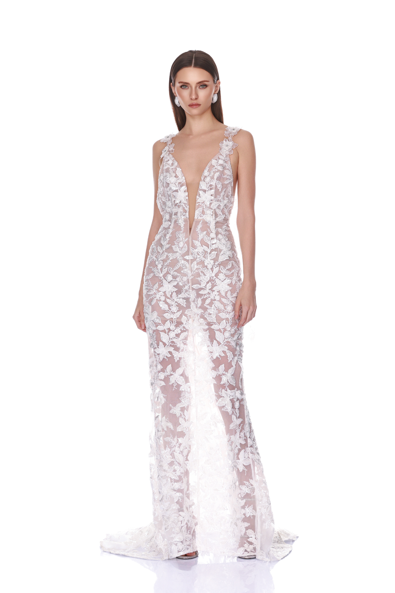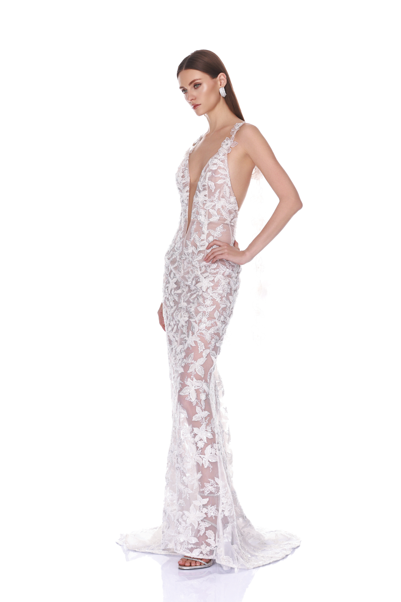 Deep-v lace gown with floral embroidery and sheer floor-length silhouette.