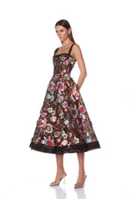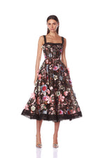 Romantic craftsmanship defines the Amanda Pink Midi Dress, featuring a corset silhouette with intricate floral appliqué.