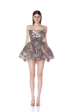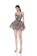 Embrace glamour in our Chloe Silver Strapless Mini — offering a flawless fit with a structured peplum skirt and floral appliqué.