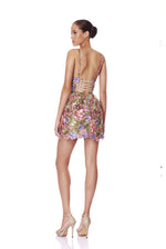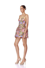 Dazzle in the Iris Floral Aria V-Neck Mini Dress in Pink Purple Multi — a captivating blend of sophistication and whimsy.