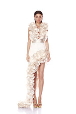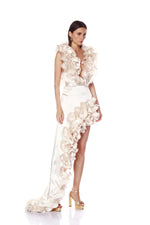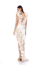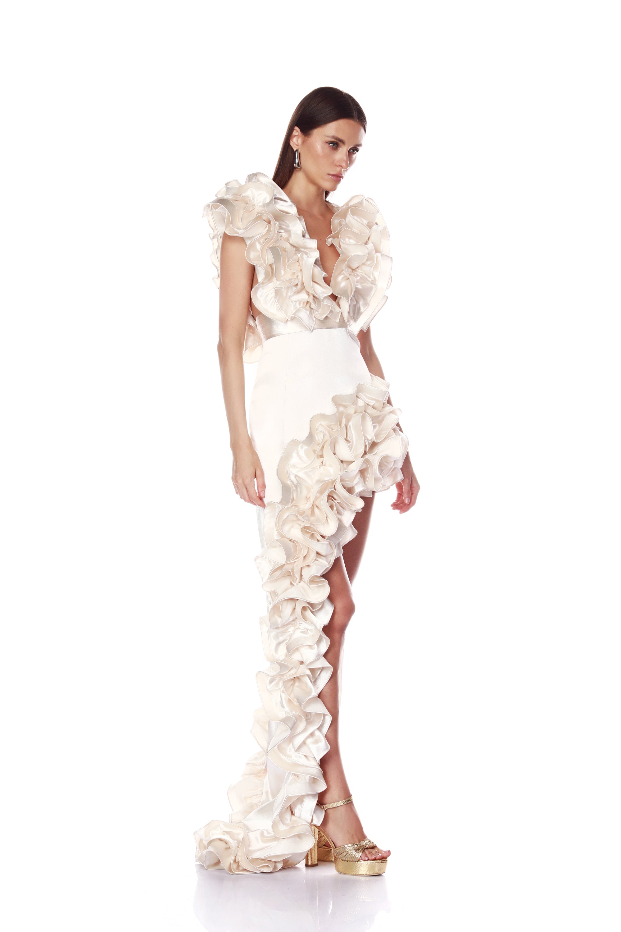 The Aurora Cream Gown exudes effortless elegance with voluminous cascading ruffles and a high-shine finish, a striking balance of structure and drama.