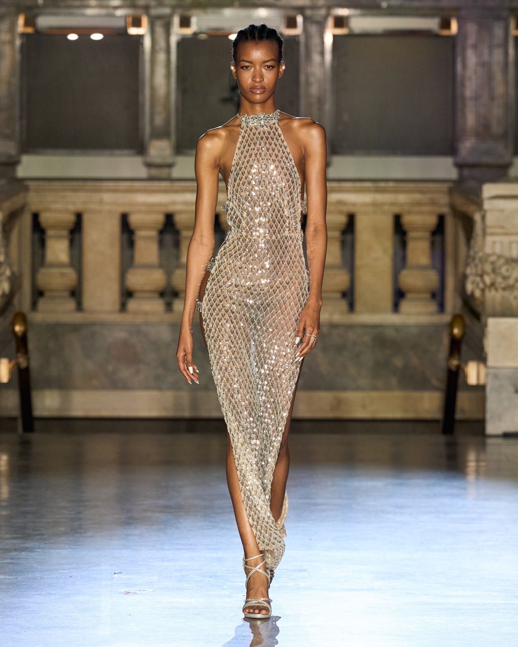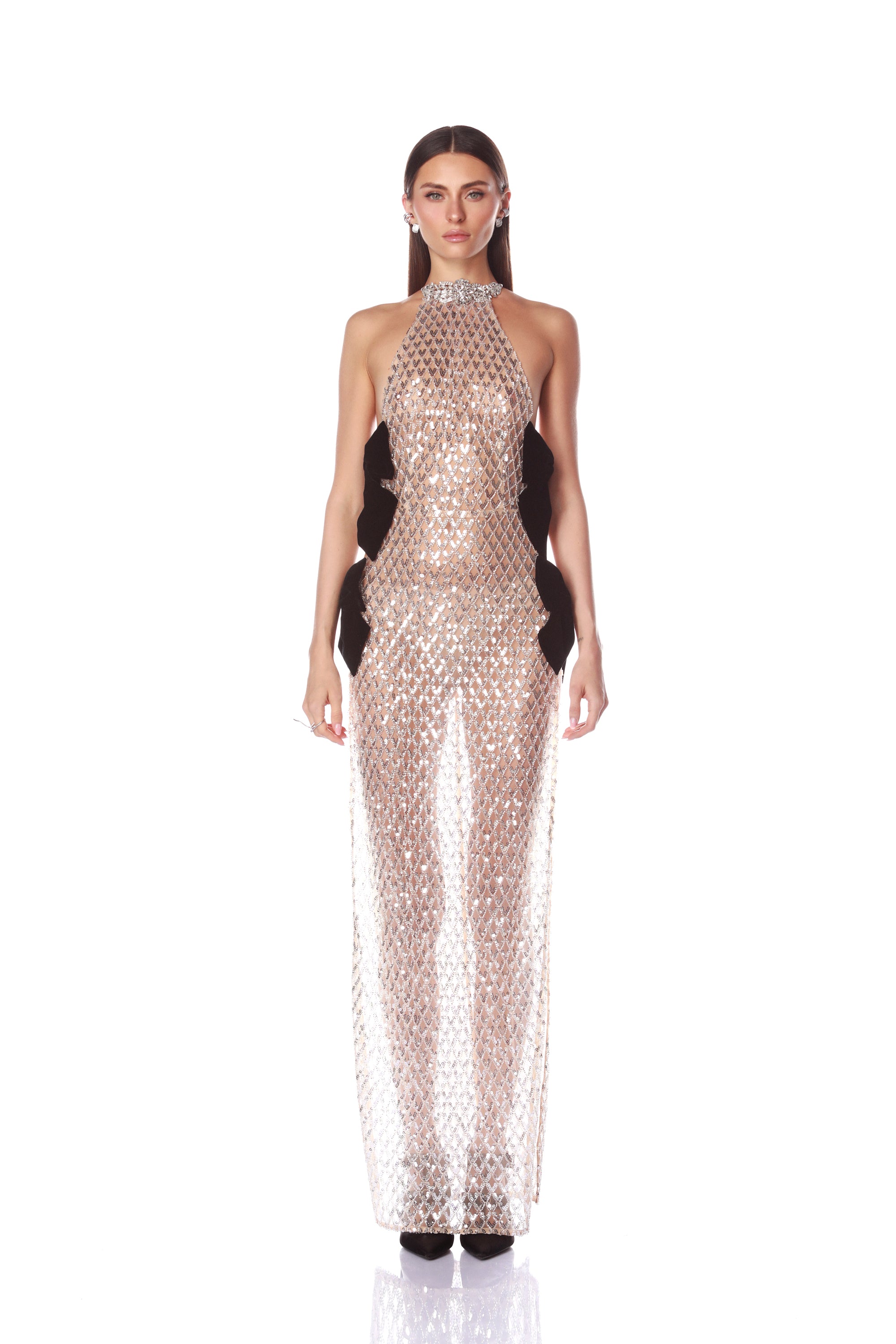 Turn heads in the Maeve Halterneck Maxi, an elegant silver embellished dress with cutout details.