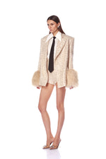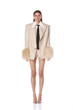 Make a stunning statement in the Kacey Tan Sequin Blazer, finished with luxurious fur-trimmed sleeves.