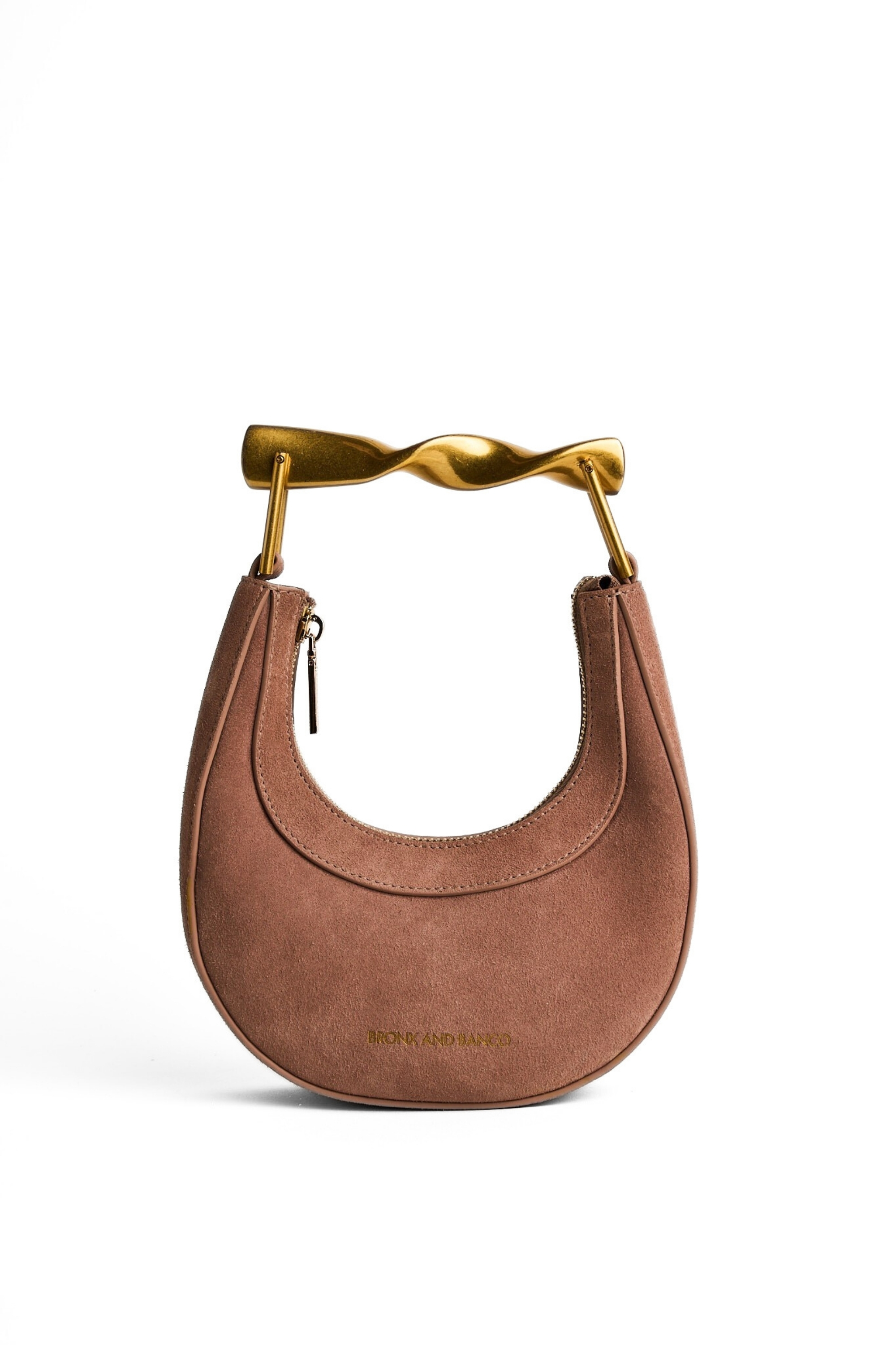 A mini crescent silhouette handbag crafted in a soft blush suede, featuring a polished twisted brass top handle.