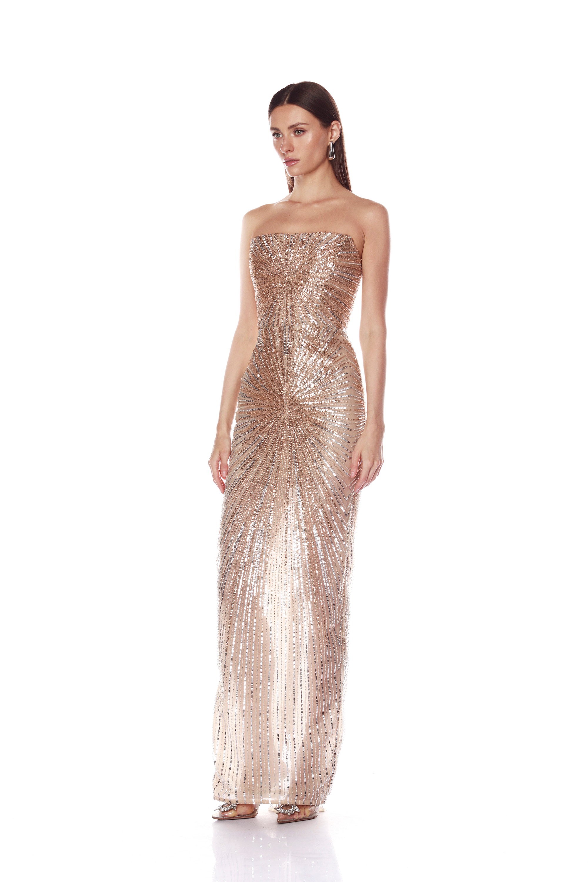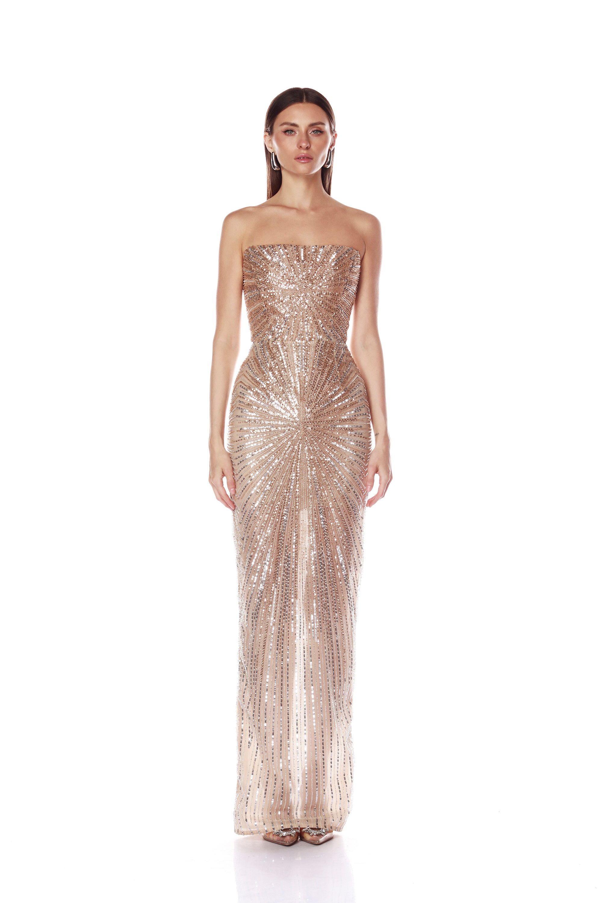 Step into elegance with our Dahlia Champagne Strapless Maxi Dress, a timeless ensemble perfect for any special occasion.