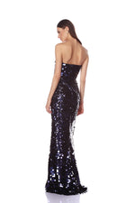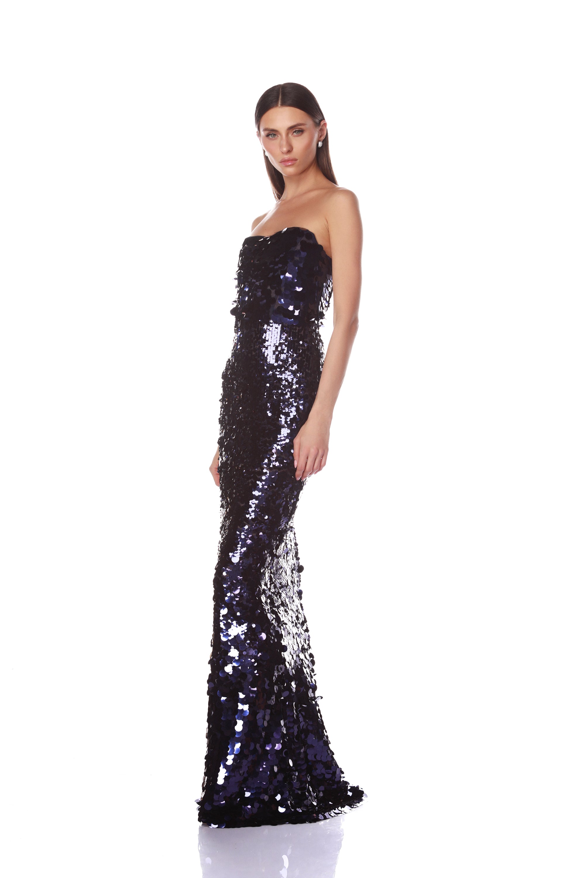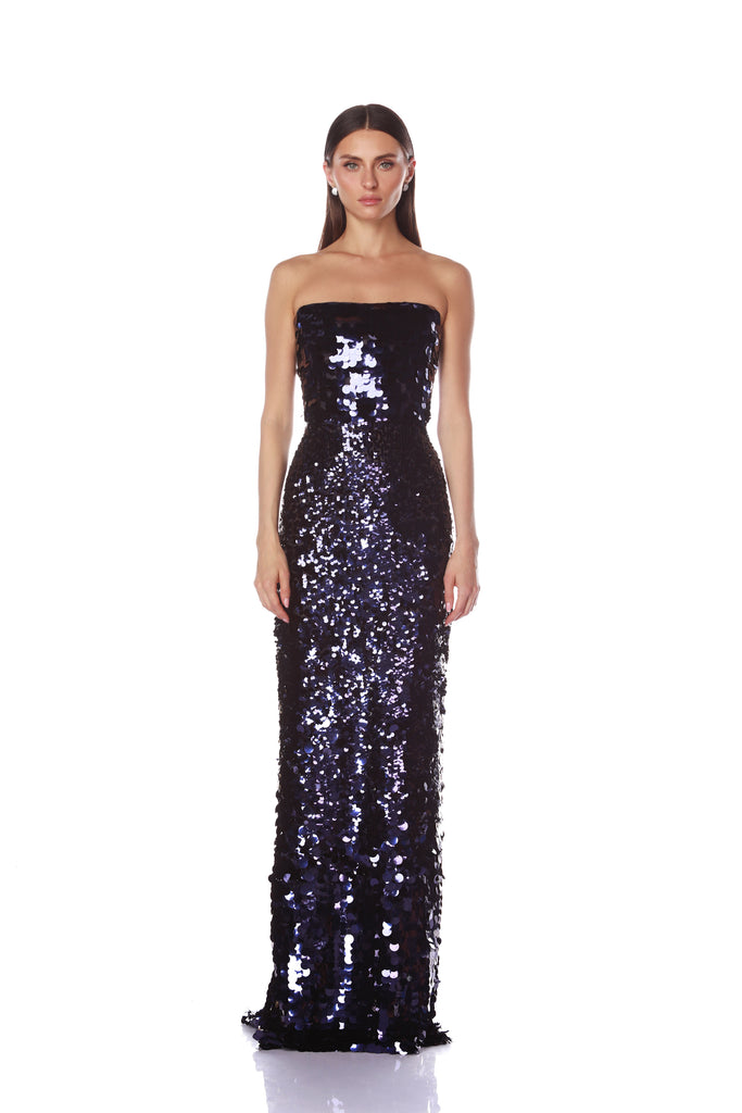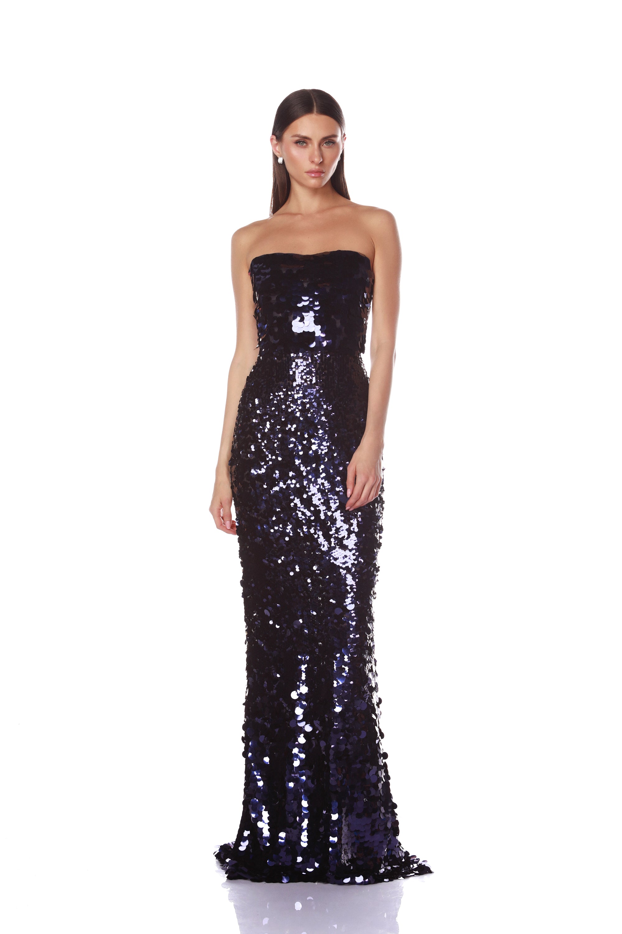Dazzle in our Farah Navy Multi Sequin Strapless Gown, the epitome of glamour and sophistication.