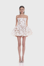 Strapless, corseted mini dress with structured peplum skirt and floral appliqué.