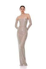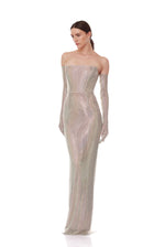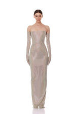 Strapless metallic column gown with long gloved sleeves and a subtle shimmer finish.