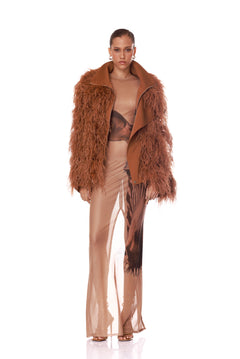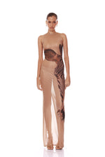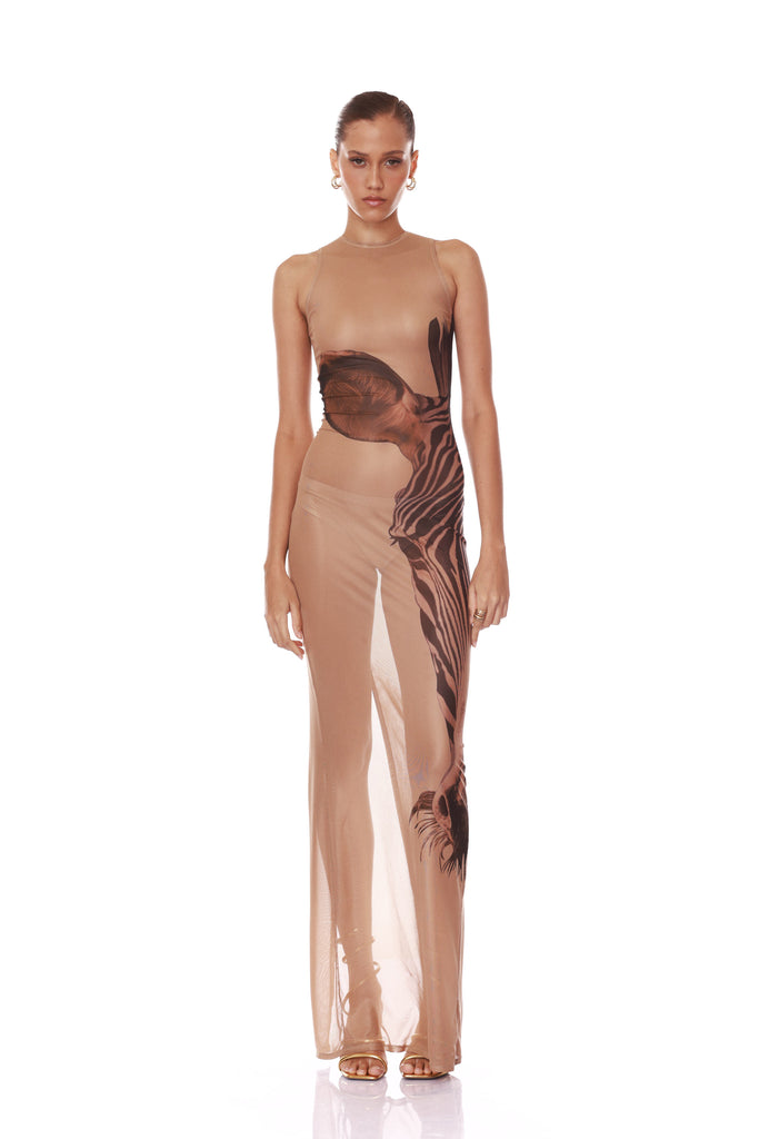 Sheer gown featuring a zebra graphic print with asymmetric paneling and a straight silhouette.