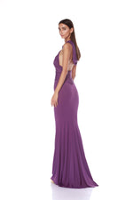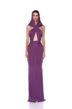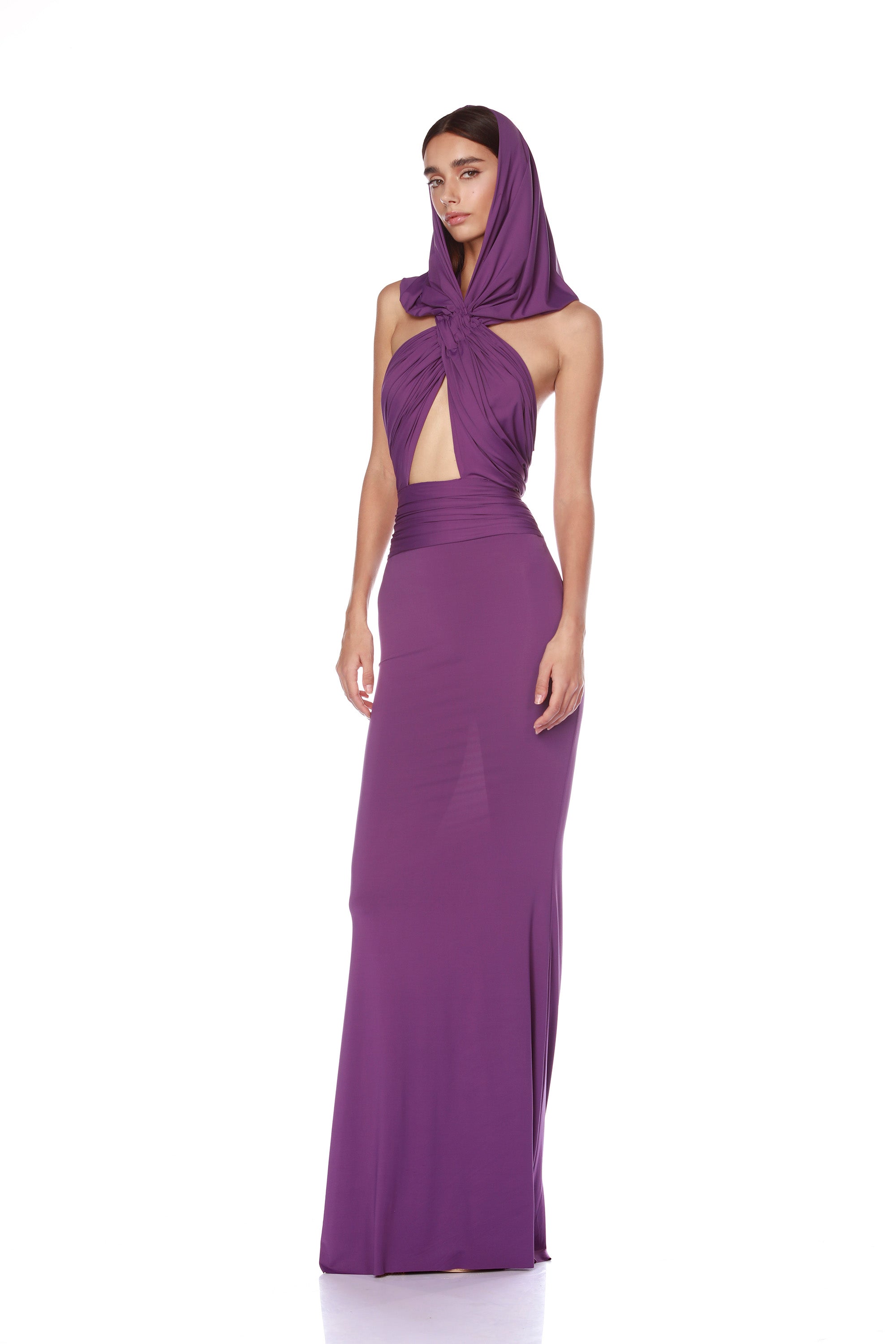 Make a statement in the Helena Violet Hooded Gown, featuring an alluring open back.