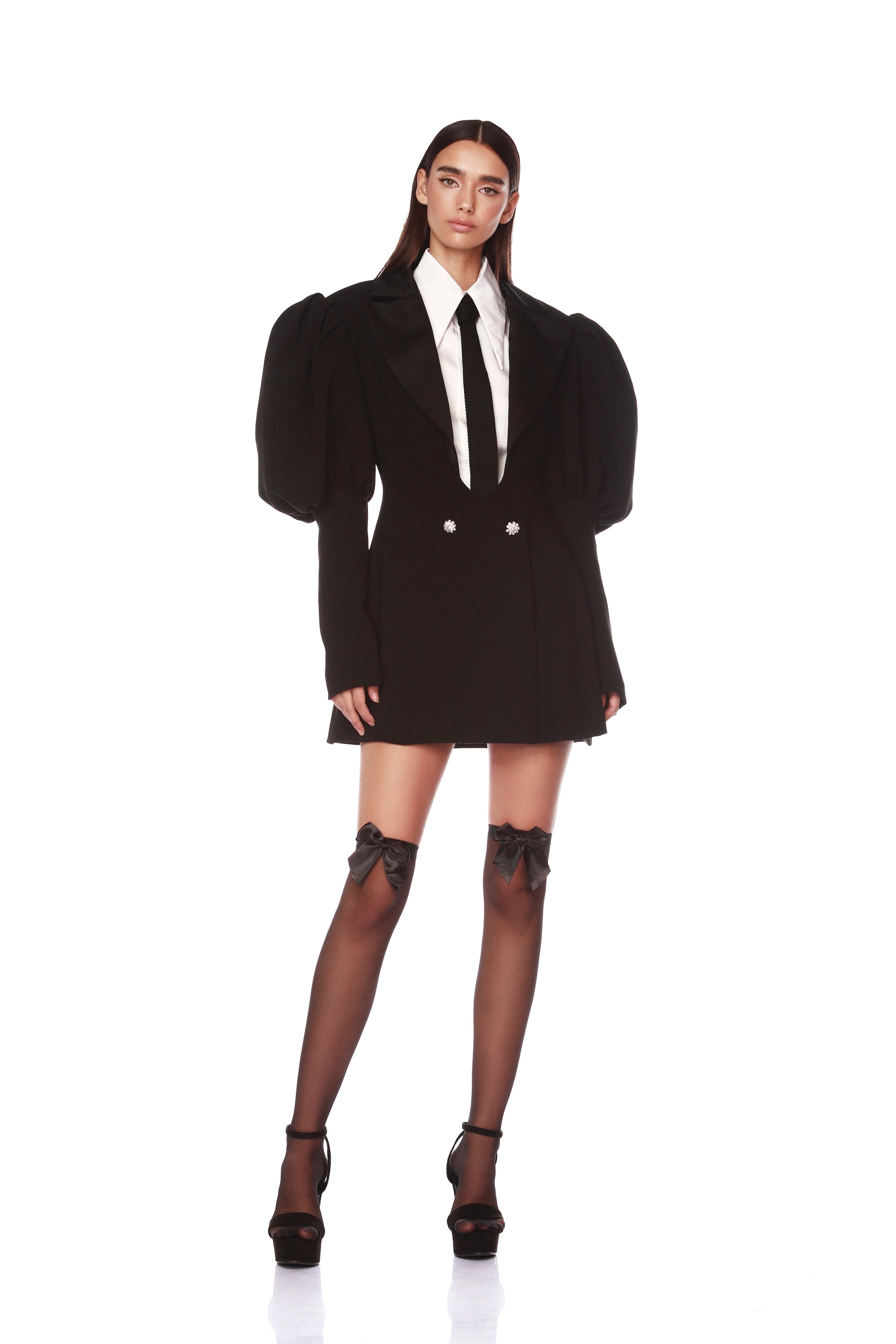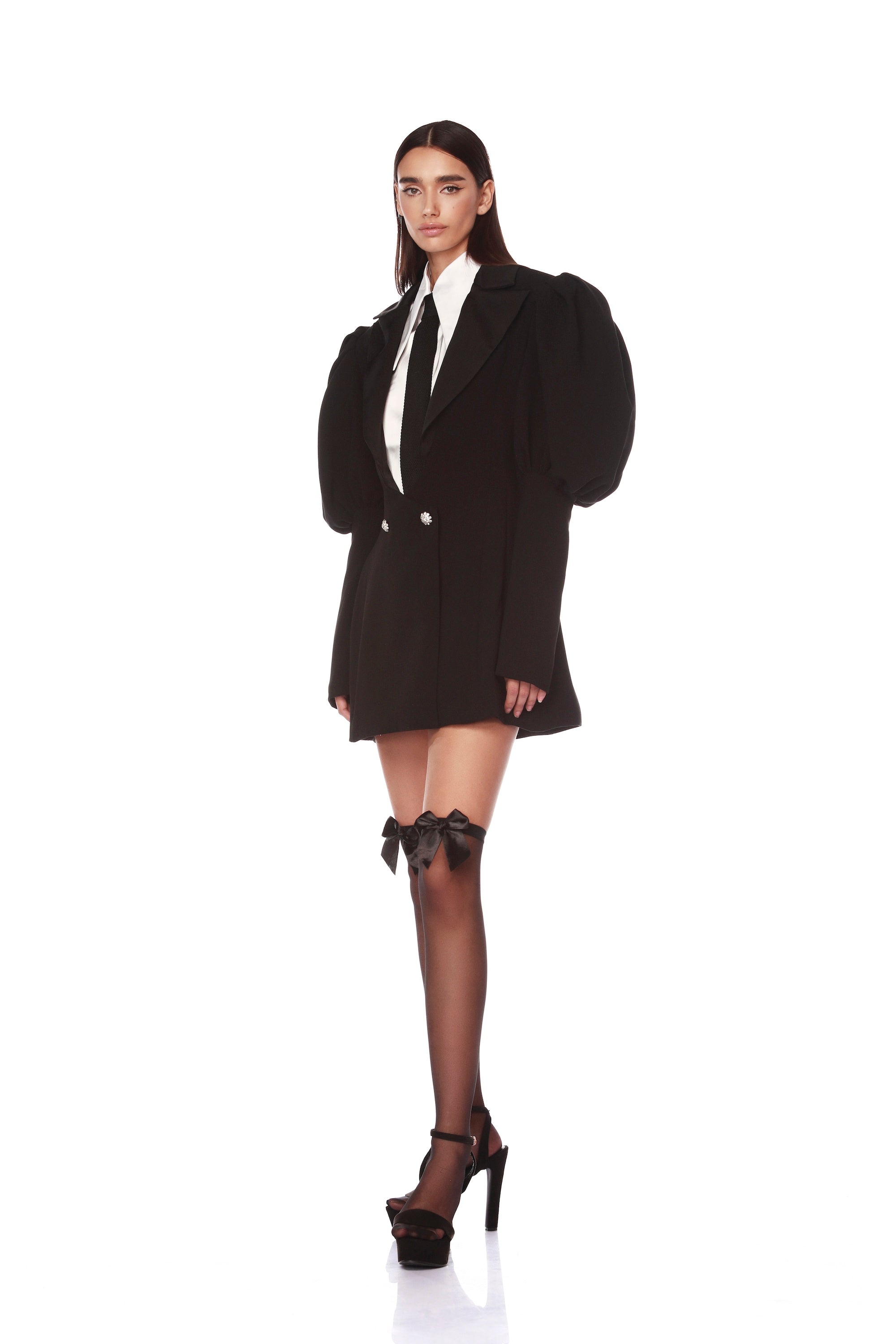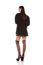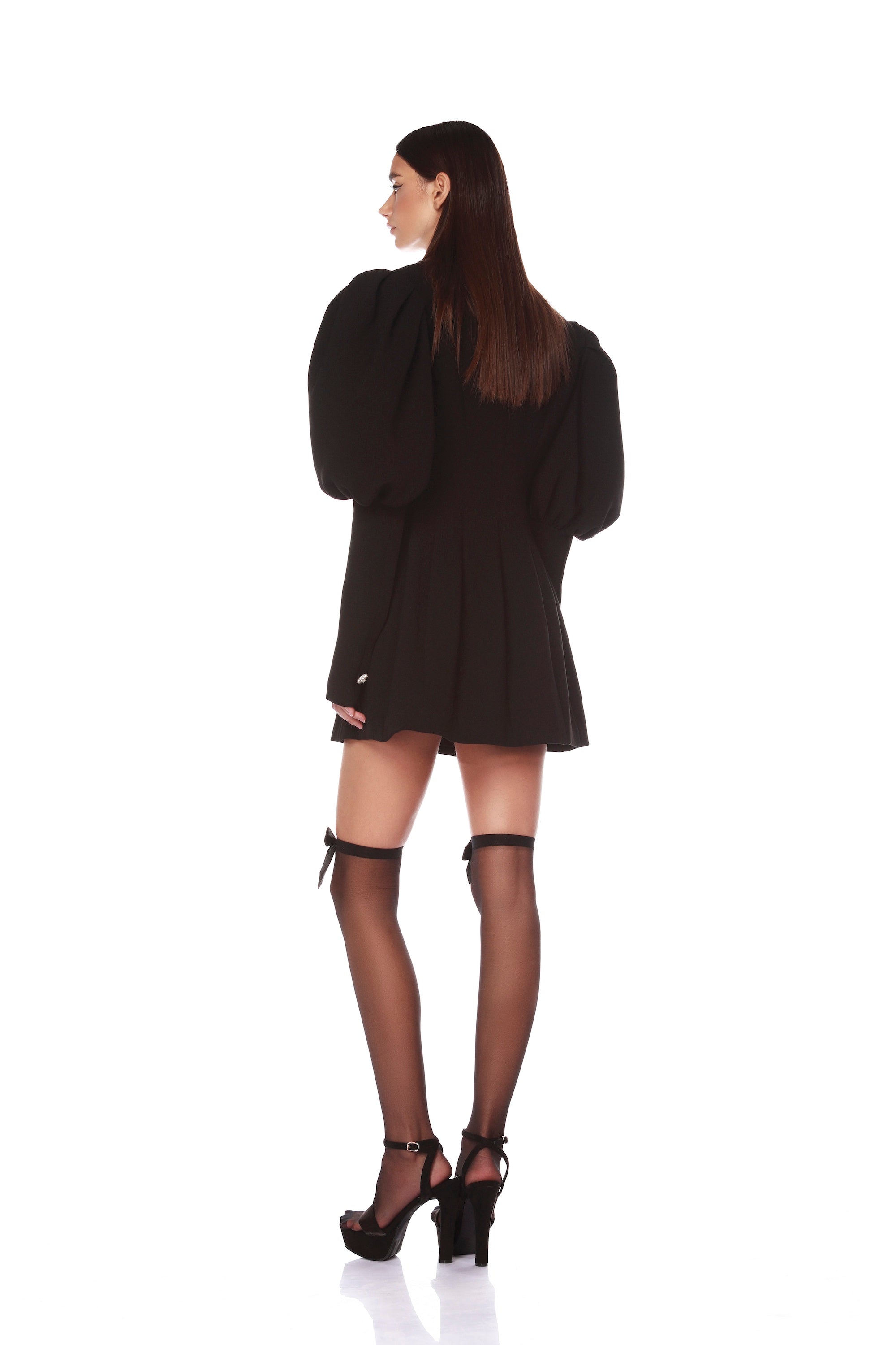 The Stella Noir Blazer Dress- an ideal choice for both professional and formal occasions. The single-breasted design, complemented by understated buttons, enhances the garment’s polished and timeless appeal.